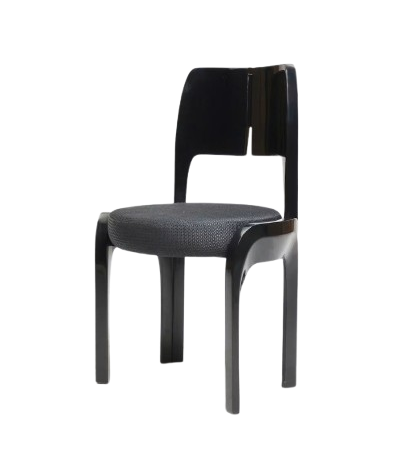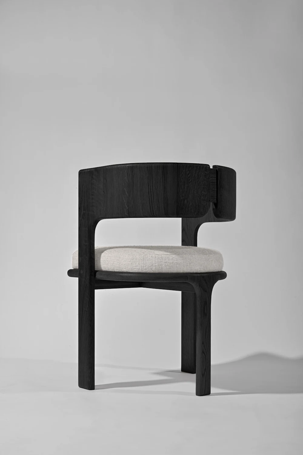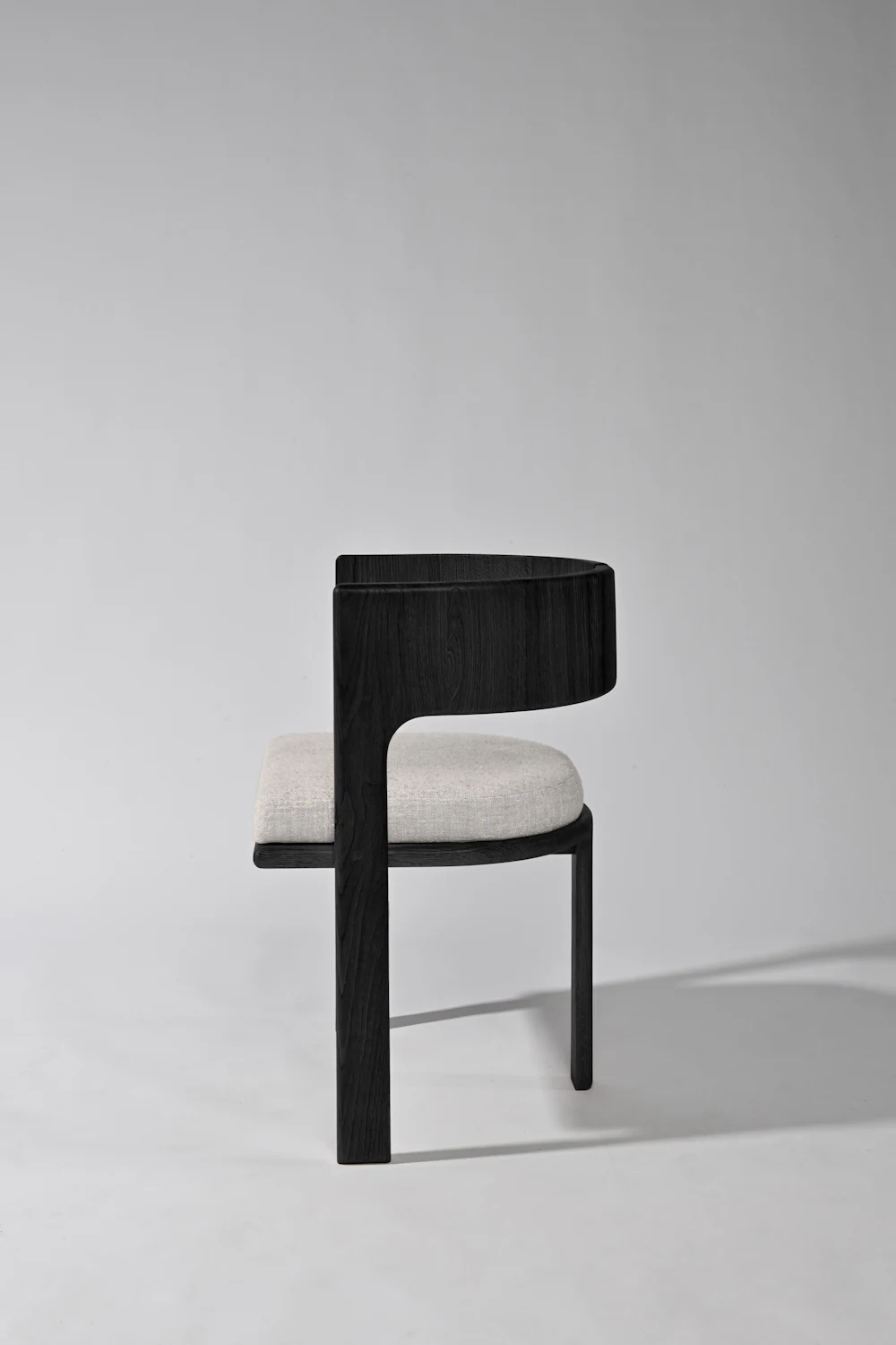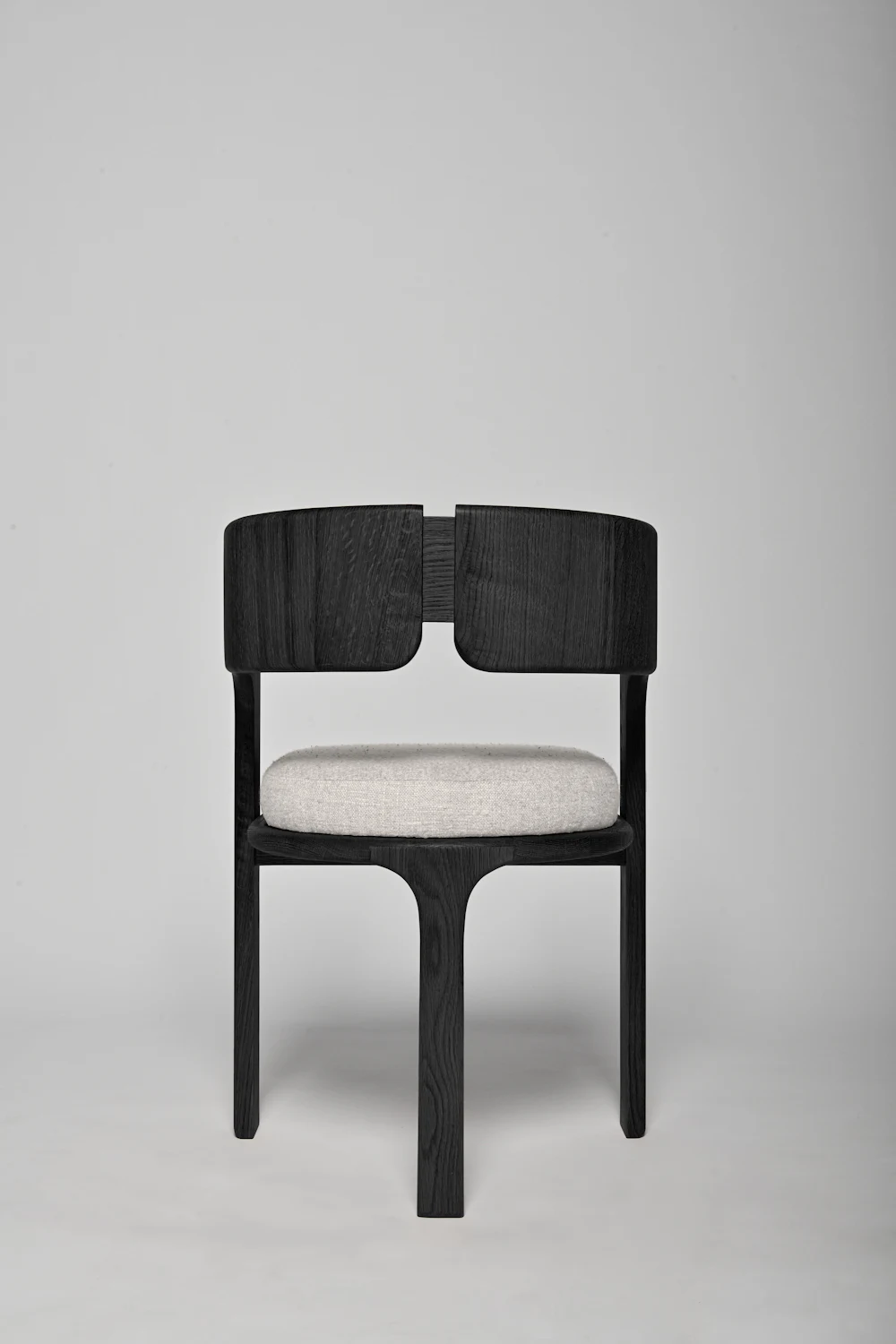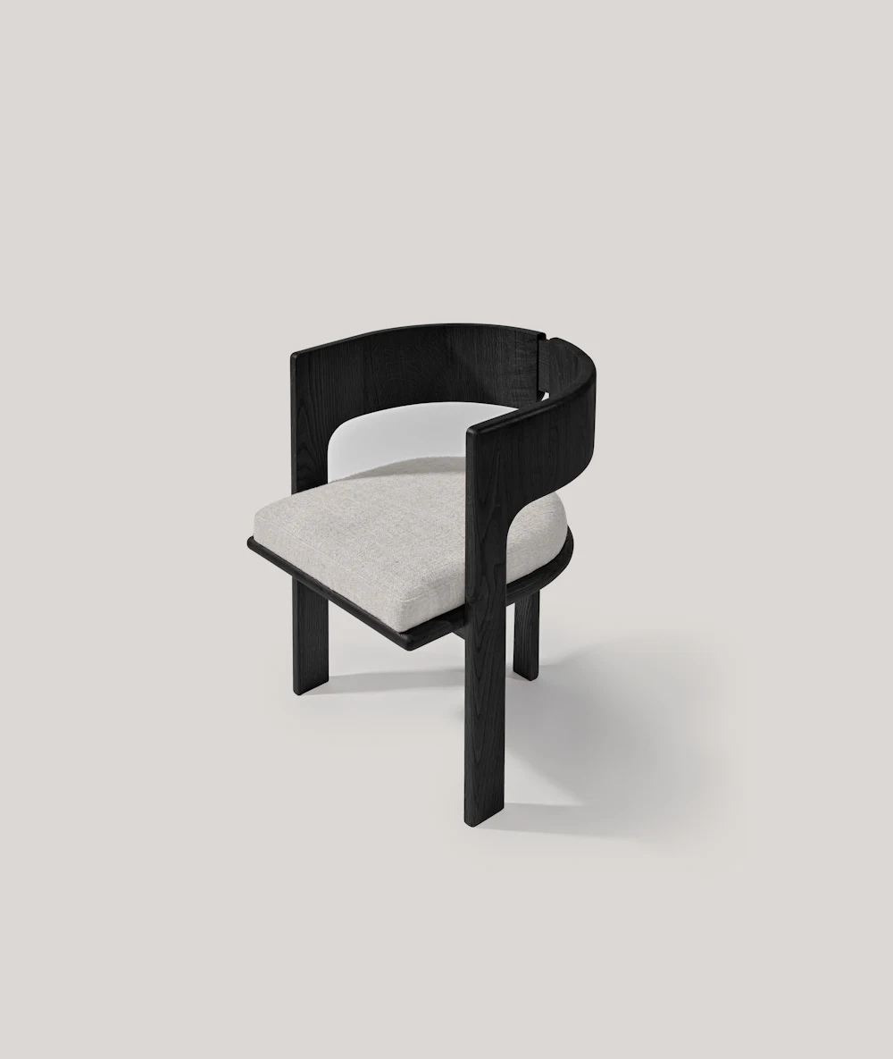 Phần tựa lưng được làm từ hai tấm gỗ cong nhẹ, đặt song song và có một khe hở ở giữa – chi tiết này vừa tạo điểm nhấn vừa giúp ghế trông thanh thoát hơn. Hai cạnh bên của tựa lưng được bo tròn mềm, liền mạch xuống phần khung.