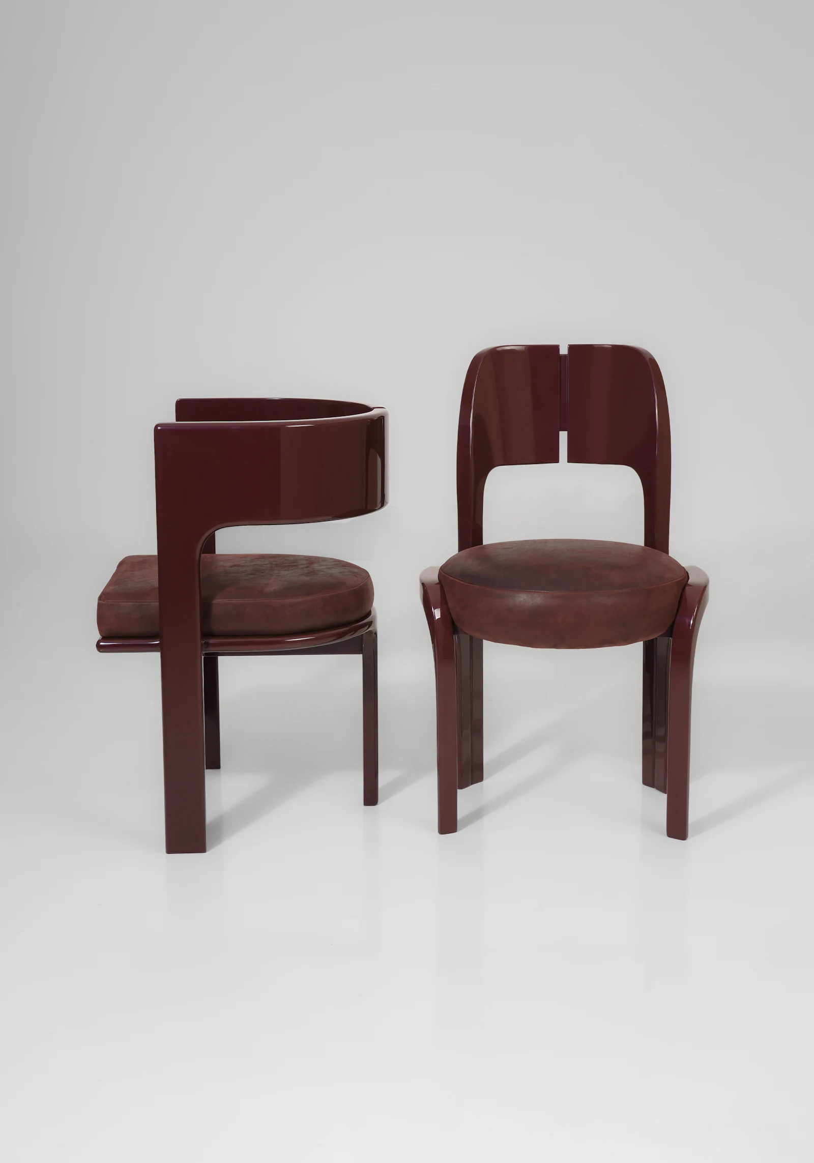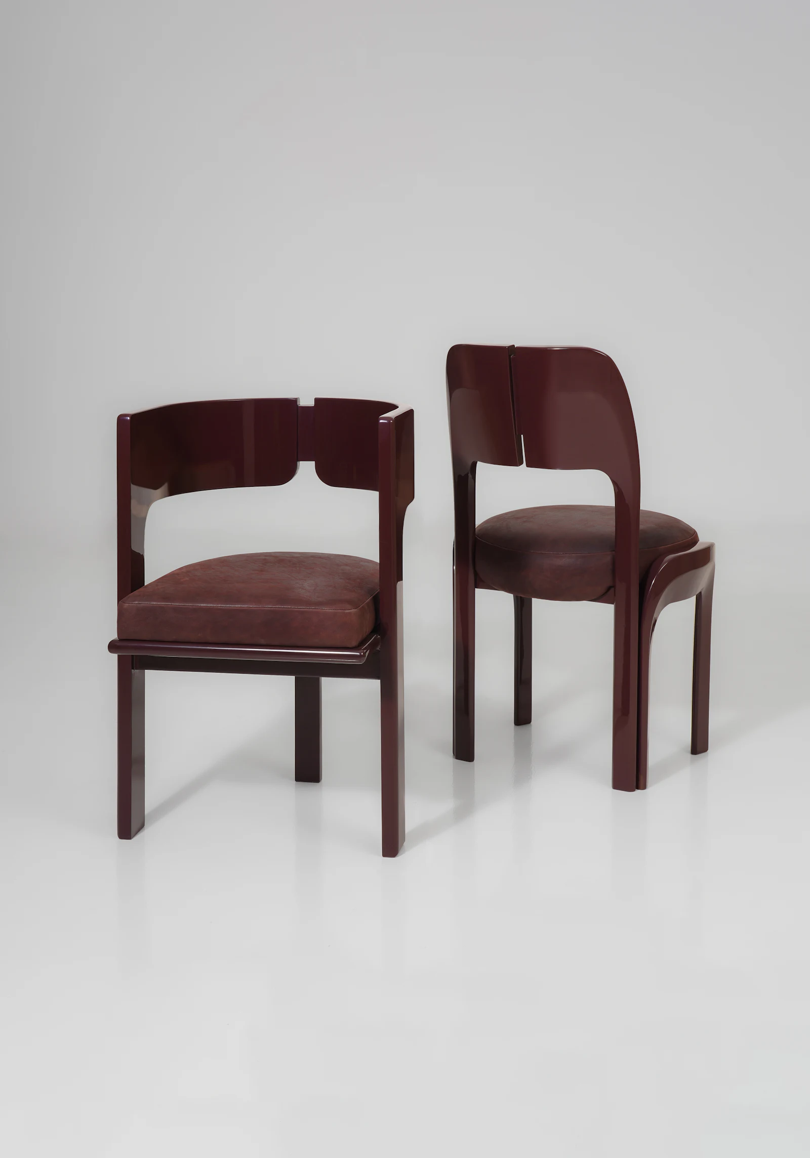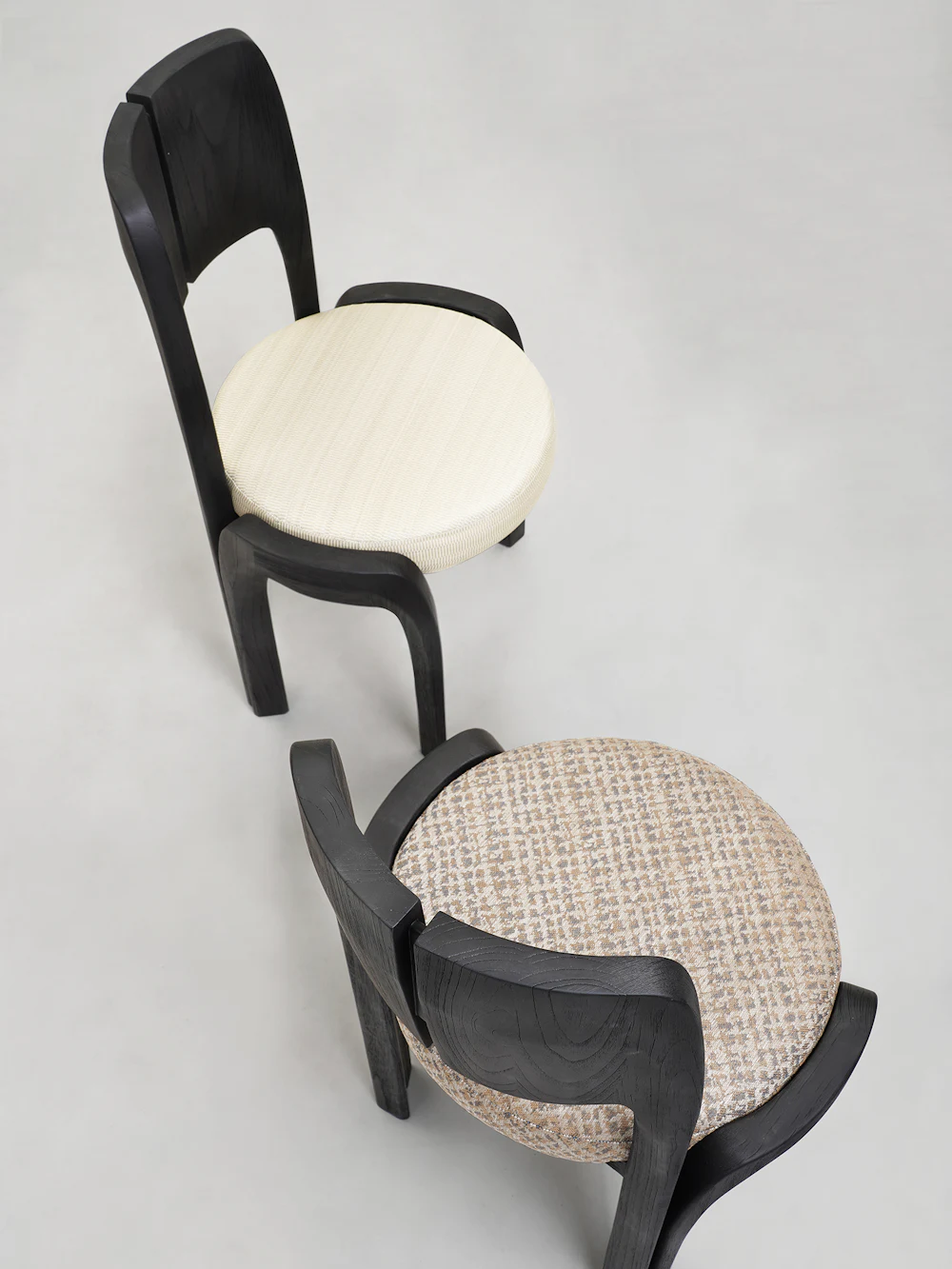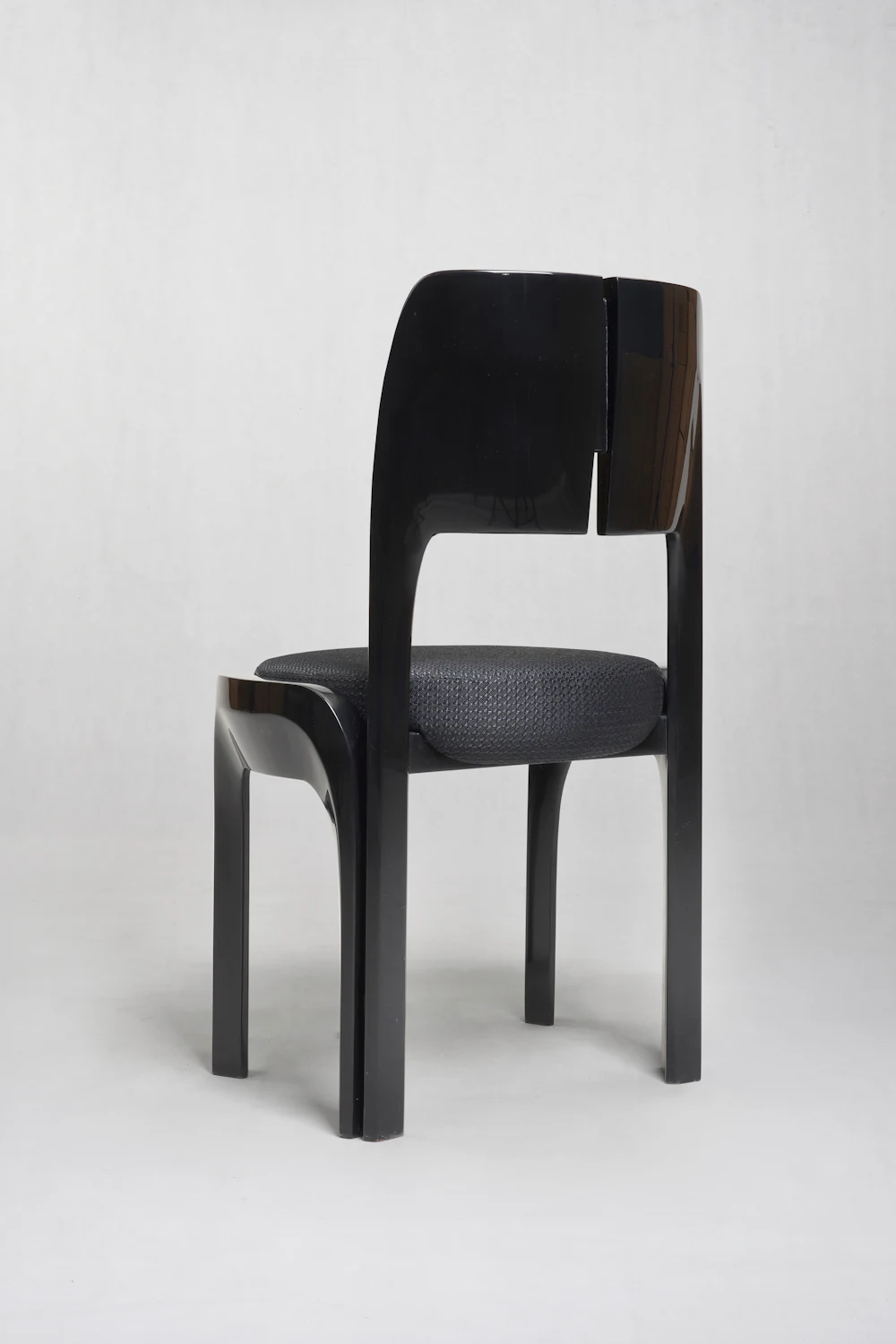 Phần tựa lưng được làm từ hai tấm gỗ cong nhẹ, đặt song song và có một khe hở ở giữa – chi tiết này vừa tạo điểm nhấn vừa giúp ghế trông thanh thoát hơn. Hai cạnh bên của tựa lưng được bo tròn mềm, liền mạch xuống phần khung.
