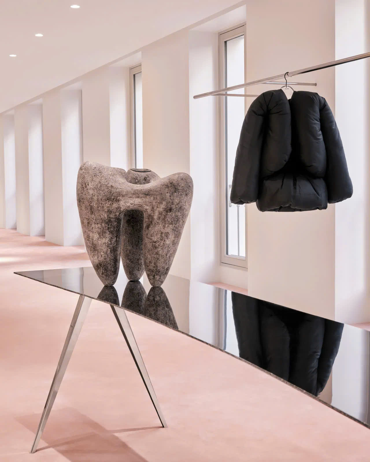 Xuyên suốt cửa hàng chính, các mặt hàng quần áo được trưng bày trên bục được thiết kế để giới thiệu từng mặt hàng như một tác phẩm nghệ thuật riêng lẻ. Mulier đã tuyển chọn các tác phẩm nghệ thuật và thiết kế yêu thích của mình để trưng bày. Một chiếc bàn của Ron Arad và ghế bành Mollo của Philippe Malouin thể hiện một cách diễn giải khác về cú pháp cong của ngôi nhà. Các tác phẩm điêu khắc của Diamond Stingily, từ bộ sưu tập Elephant Memory của cô, đặt cạnh những sợi tóc tổng hợp màu đen được tết bằng tay với những sợi xích thép mạ kẽm. Chúng được lấy cảm hứng từ những chú voi cái và đàn voi của chúng, những chú voi phát triển mối quan hệ gắn bó chặt chẽ, kết bạn và đau buồn khi chúng qua đời.