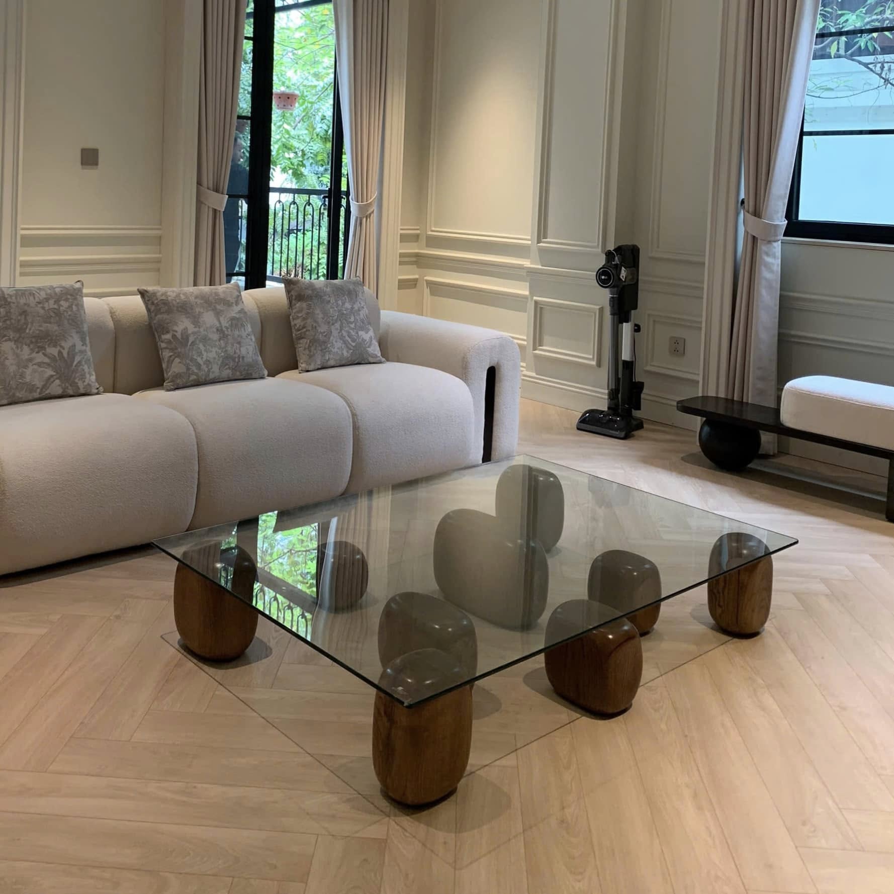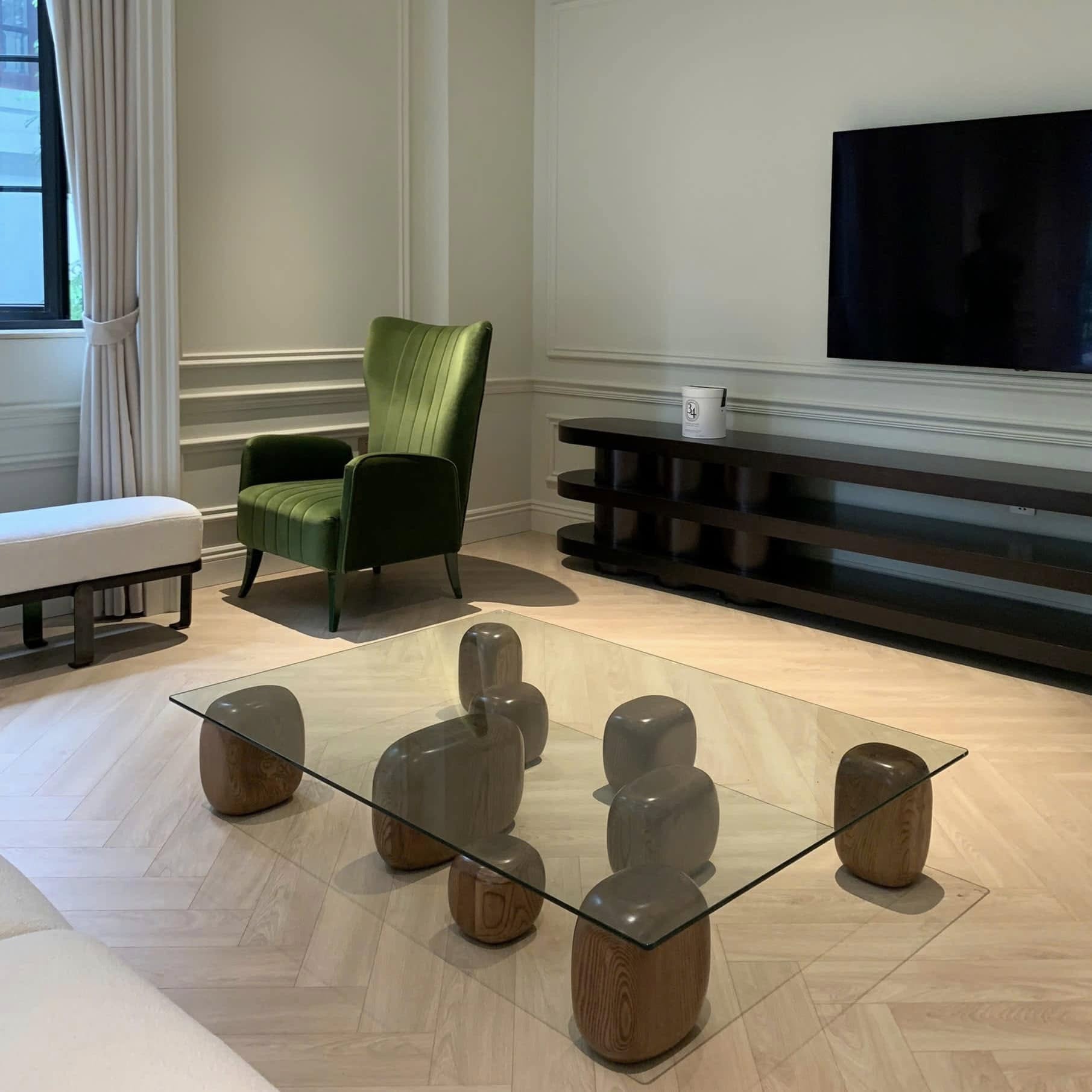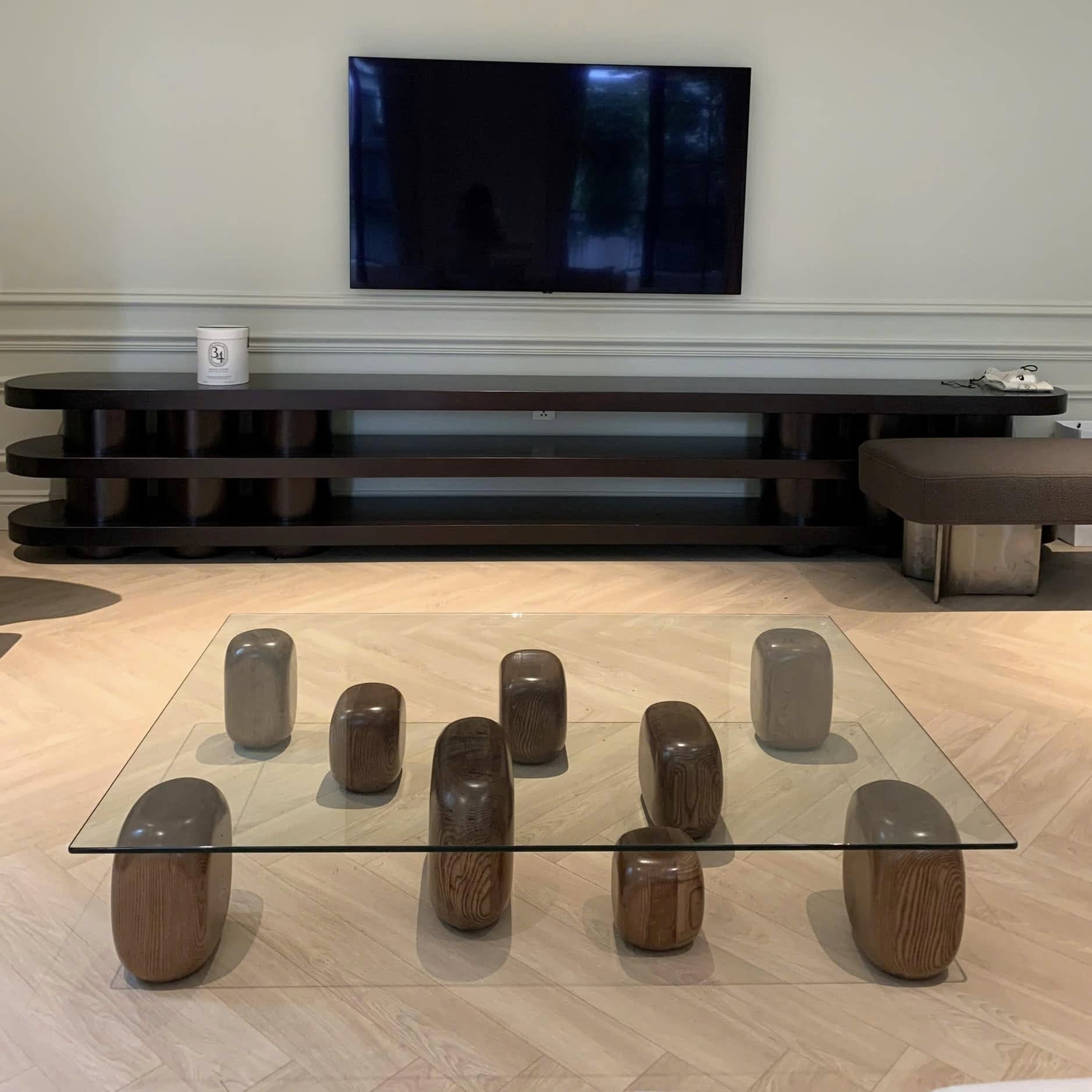 Sự rắn chắc của gỗ tự nhiên kết hợp với độ trong suốt, trở thành biểu hiện nhẹ nhàng và cụ thể của sự cân bằng phong cách của nhà thiết kế Nendo. Các khoảng trống và khối rắn, khác nhau về cách sắp xếp, kích thước và các biến thể vật liệu.