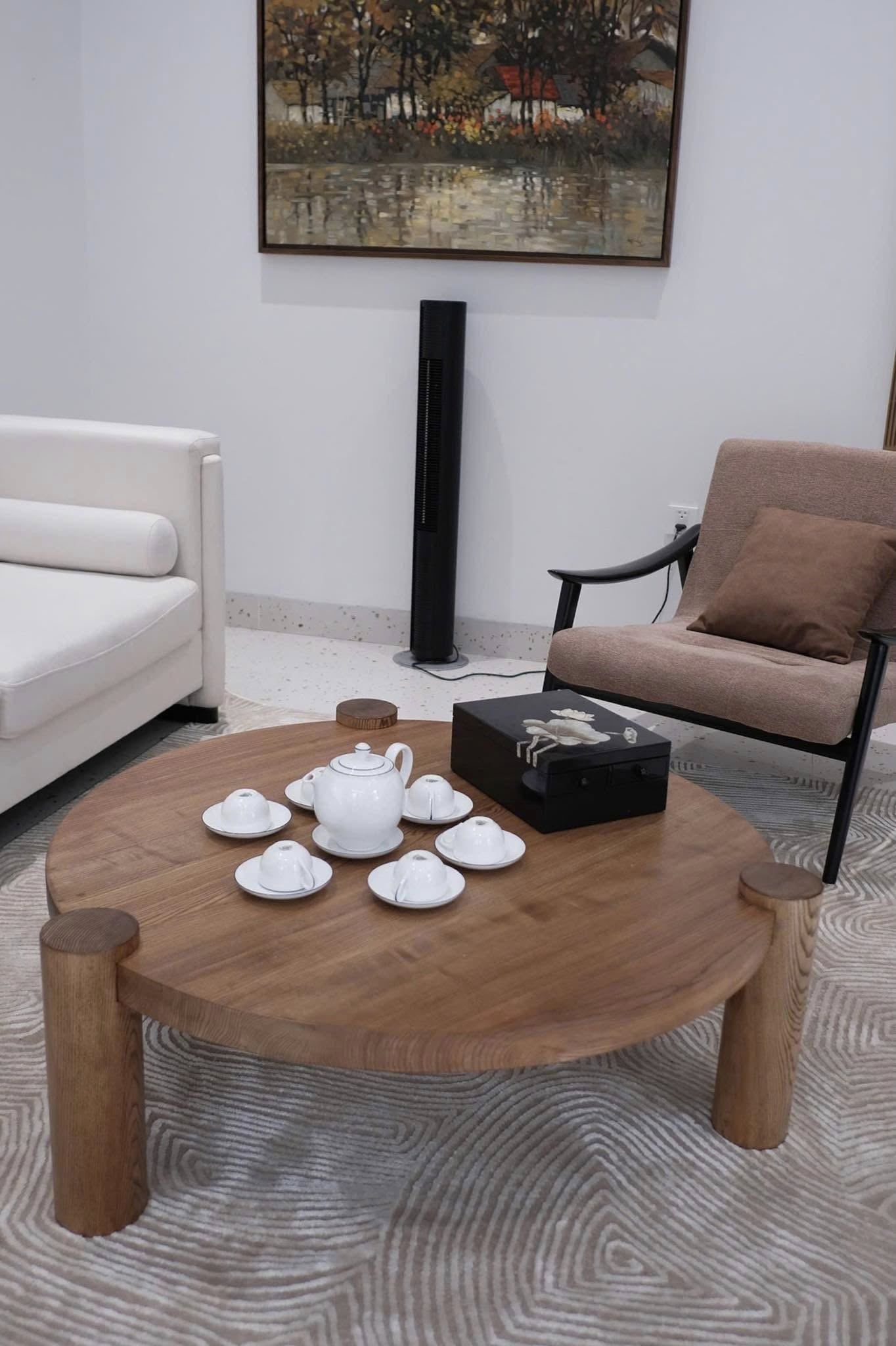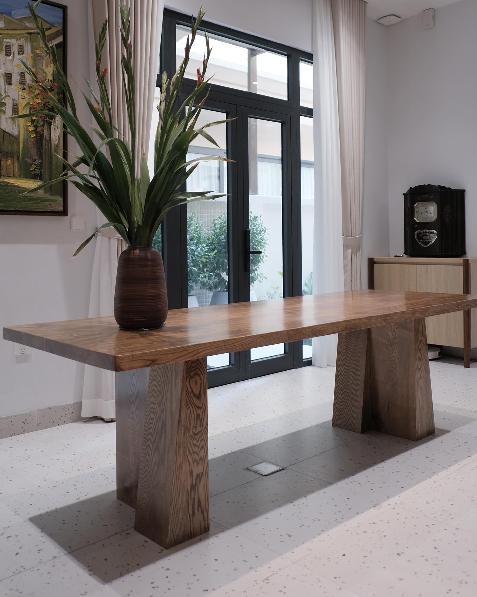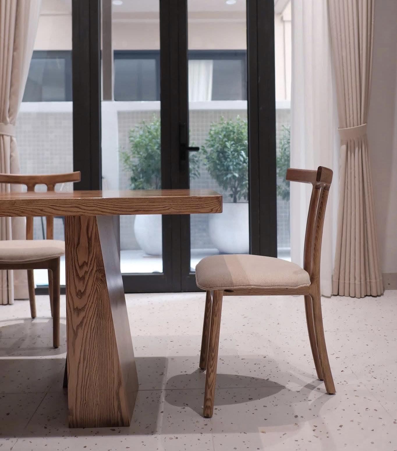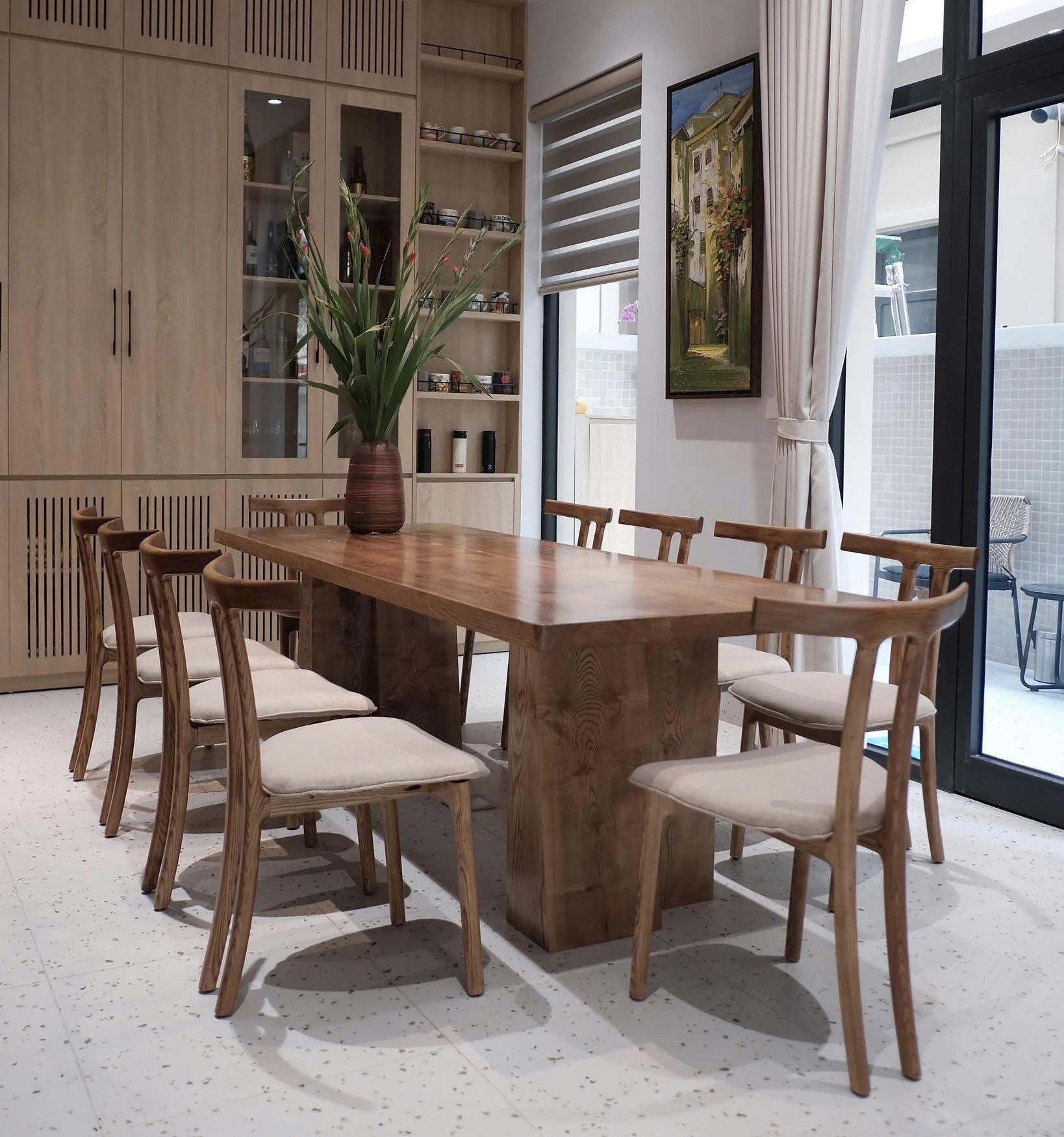 Điểm ấn tượng của chiếc bàn này là có 2 cặp chân hình thang được sắp xếp linh hoạt bên dưới mặt bàn được làm hoàn toàn bằng gỗ tự nhiên , mang lại cảm giác chắc chắn ấn tượng không rời mắt . Gia chủ cũng vô cùng khéo léo khi lựa chọn tone màu gỗ làm nổi bật từng đường vân mộc một cách hoàn hảo nhất .
