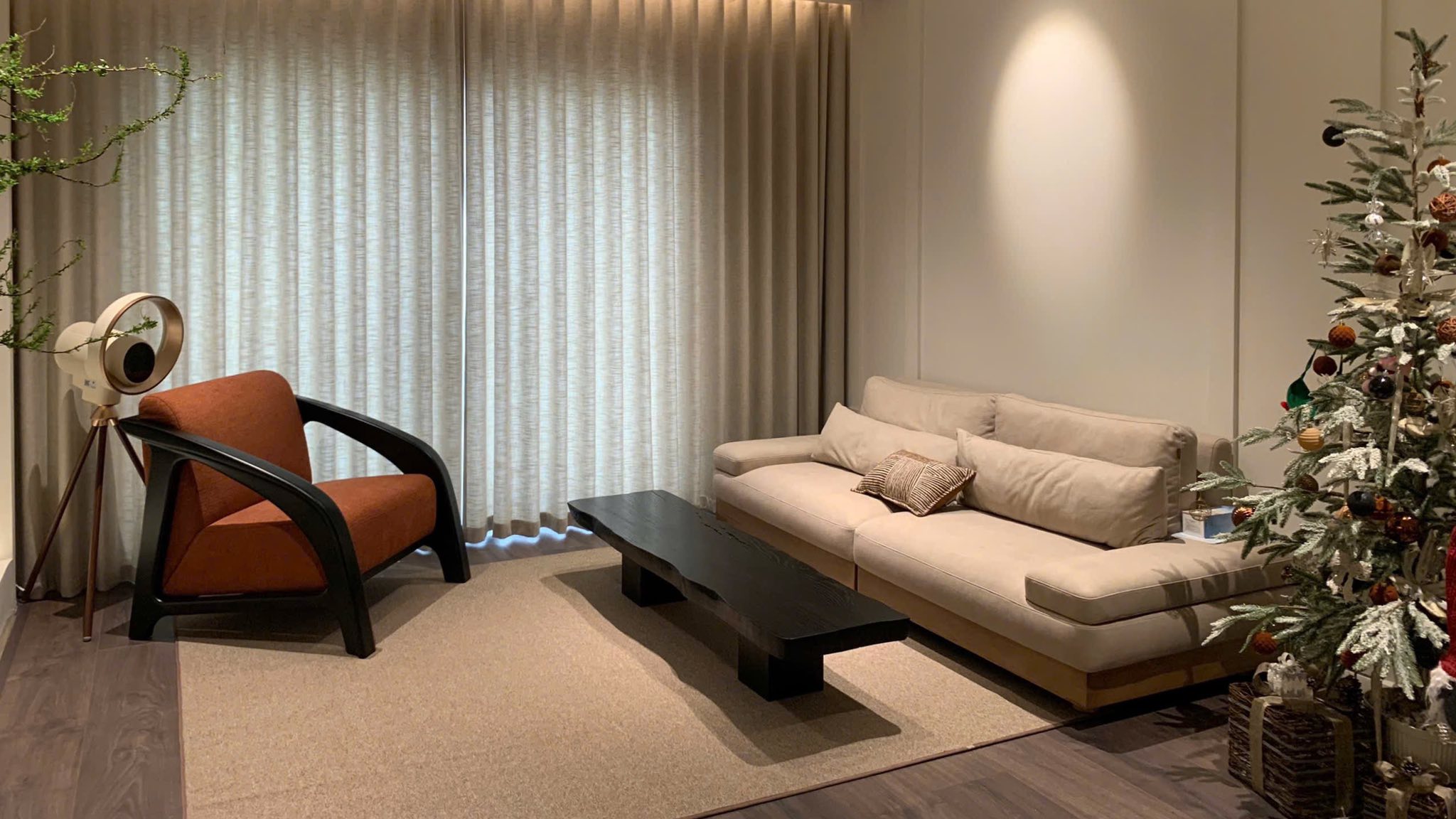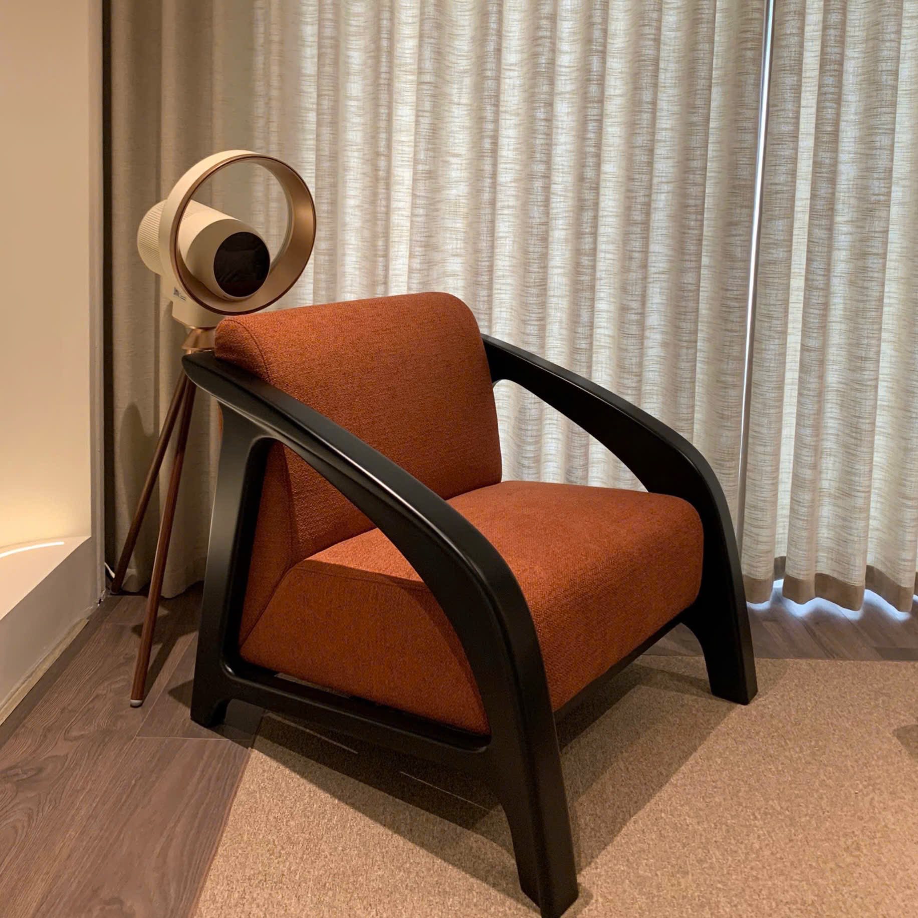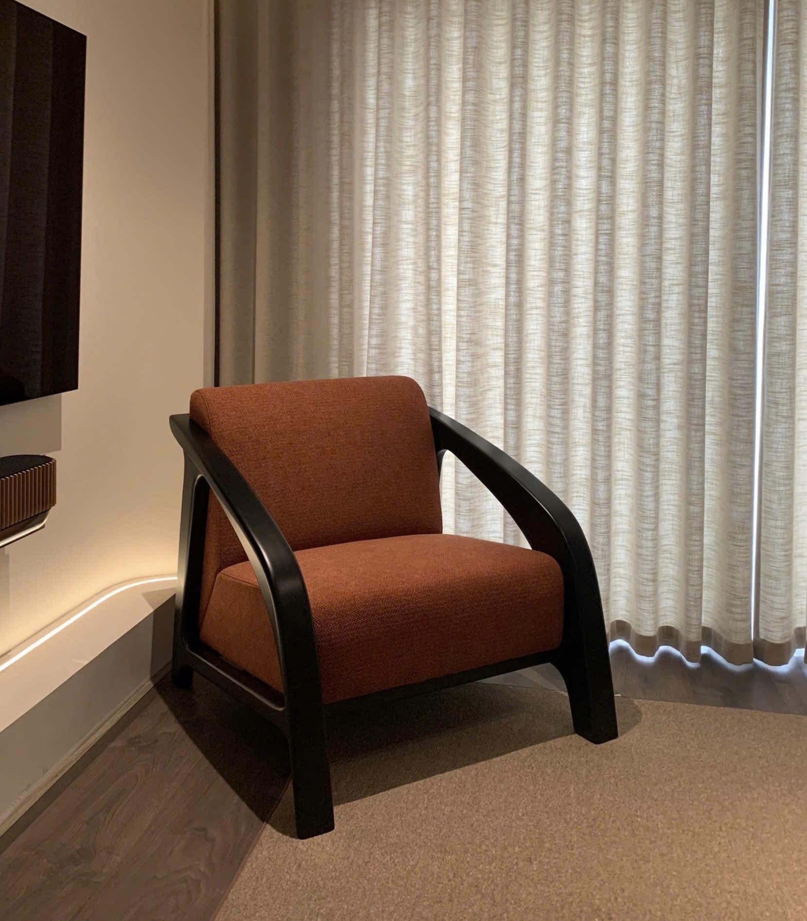 Chiếc ghế như một điểm nhấn trầm ấm giữa căn phòng tĩnh lặng. Sắc cam đất gợi cảm giác của lửa chiều, được ôm trọn bởi khung gỗ đen uốn cong mềm mại, vừa vững chãi vừa giàu tính điêu khắc.