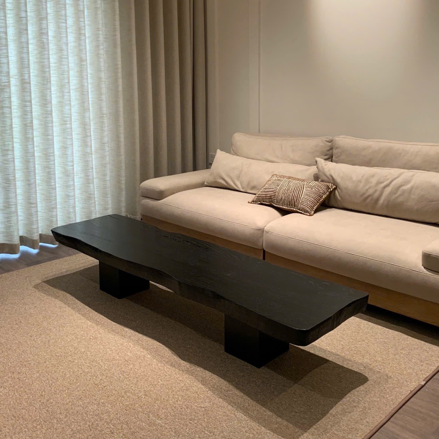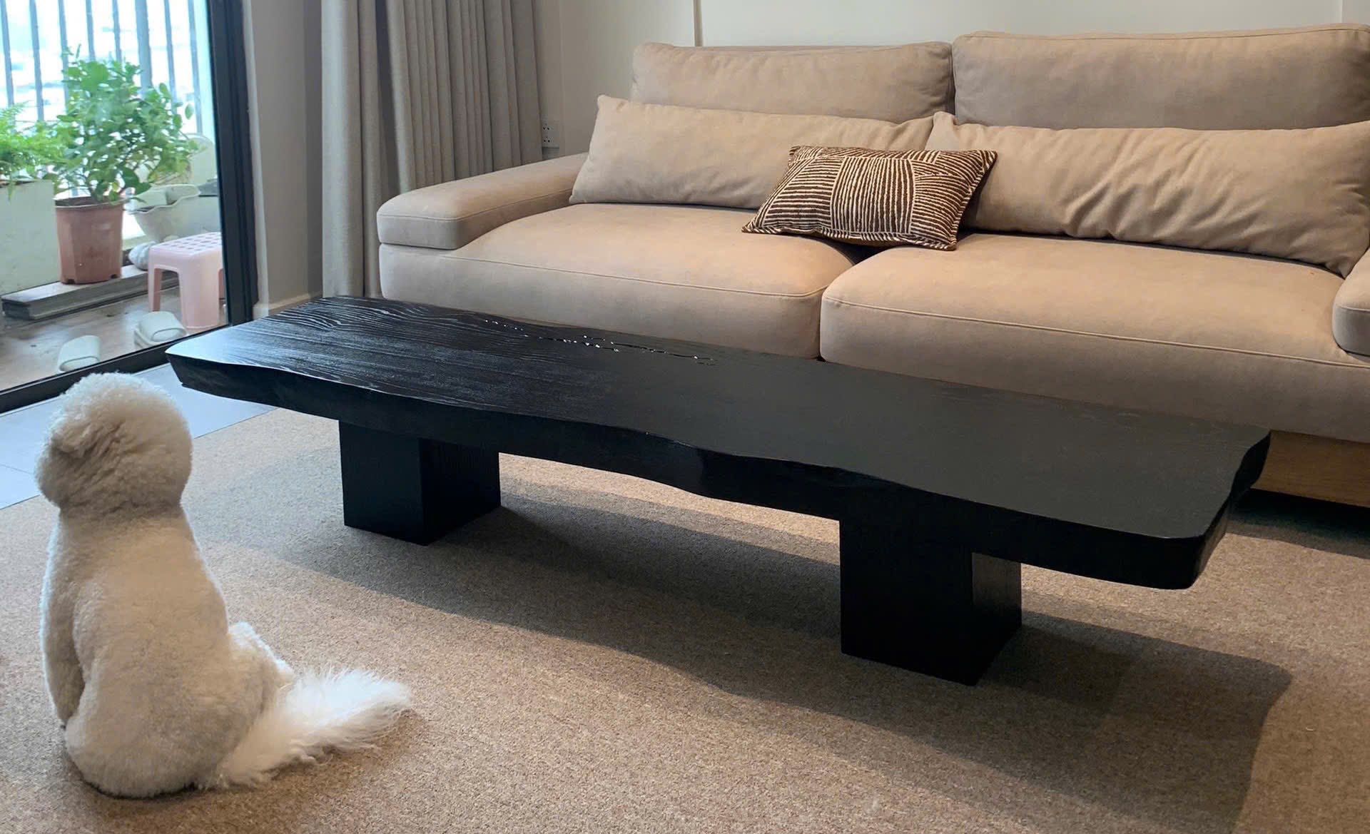 Mặt bàn được giữ gần như nguyên bản, đường vân gỗ hiện rõ mộc mạc, không phô trương mà đủ để người nhìn nhận ra dấu vết tự nhiên. Lớp hoàn thiện đen lì, khiến bề mặt gỗ không phản chiếu mà hấp thụ, tạo cảm giác sâu và chắc. Phần chân bàn vuông vức, đặt lùi vào trong nâng đỡ toàn bộ khối bàn một cách âm thầm, để trọng tâm thị giác dồn về mặt gỗ trải dài phía trên. Chiếc bàn không cố trở thành điểm nhấn, nhưng chính sự kiệm lời ấy lại khiến nó hiện diện rõ ràng - những khoảng lặng cần được giữ nguyên.