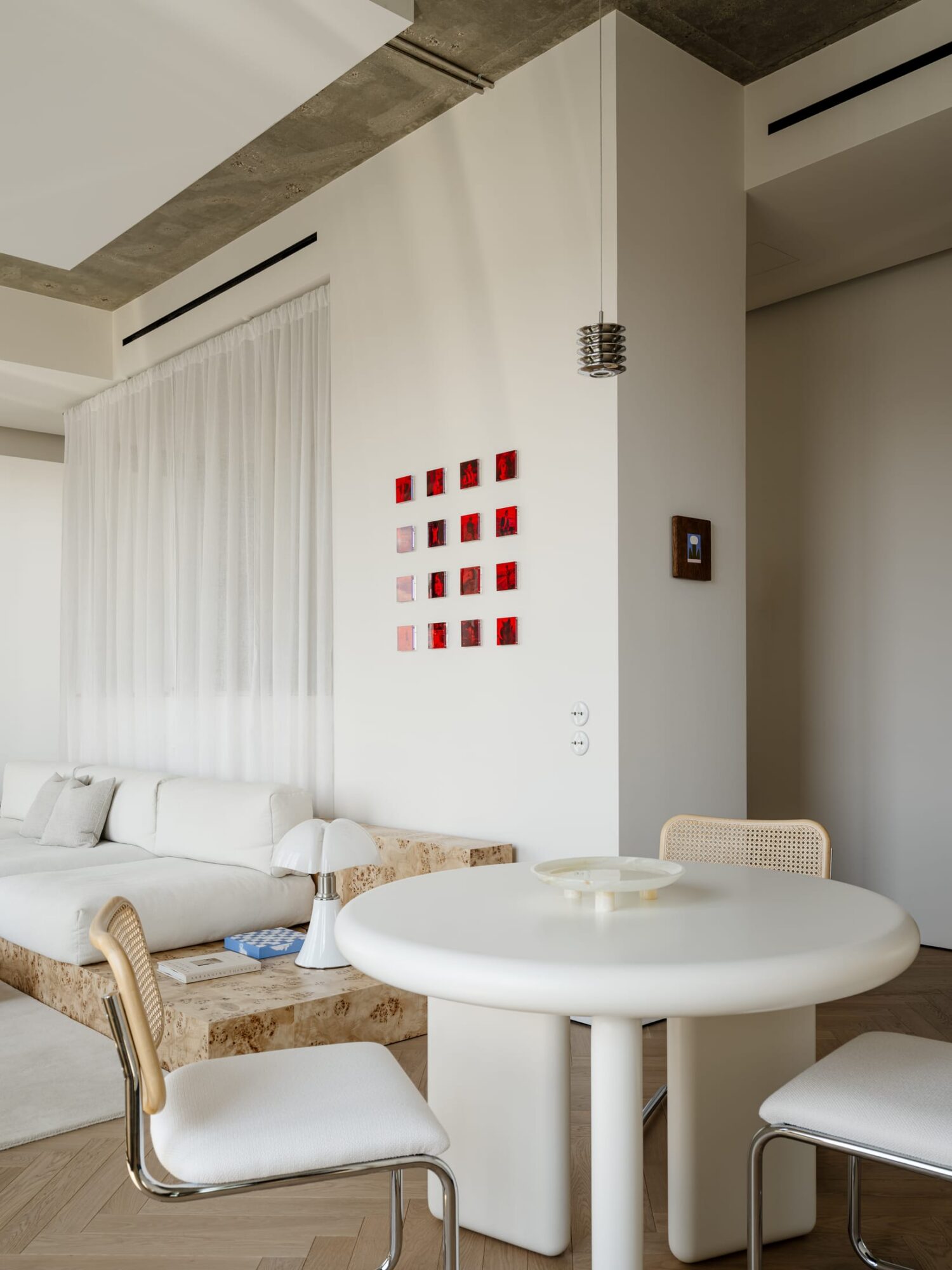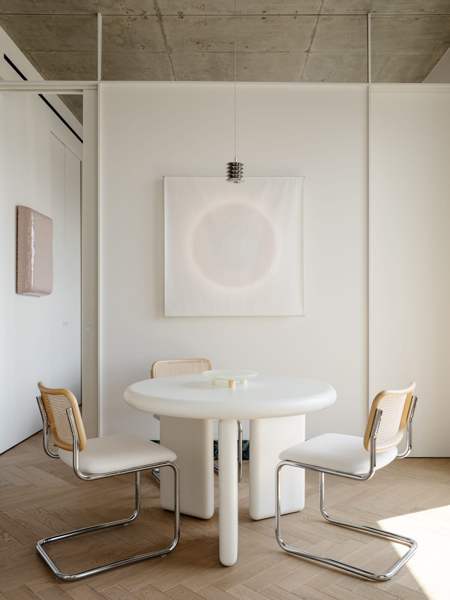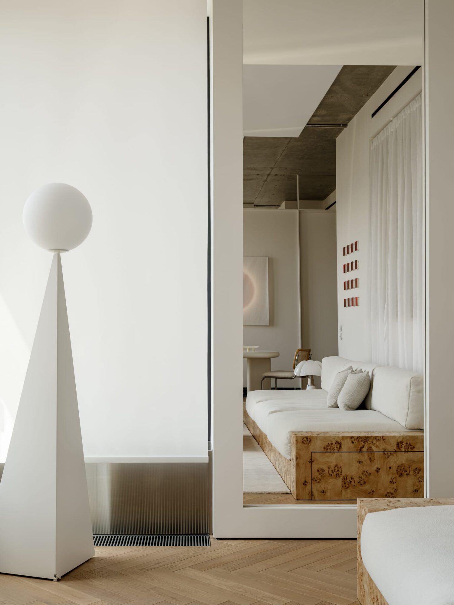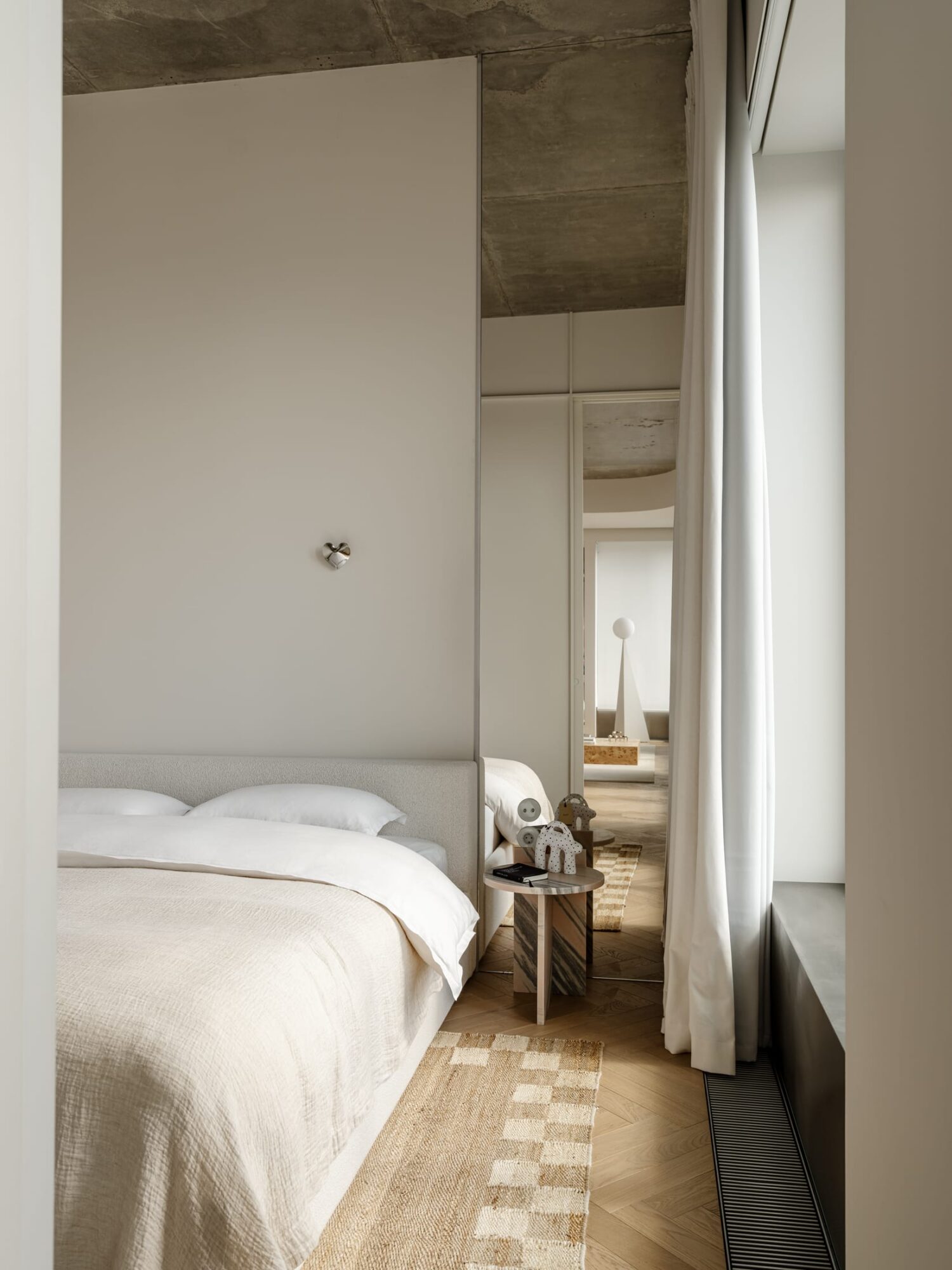 Việc bố trí lại hoàn toàn mặt bằng đã biến căn hộ thành một không gian lưu thông tuần hoàn liên tục, tạo nên một đài quan sát ngoạn mục trên cao nhìn xuống thành phố. Tầm nhìn toàn cảnh thành phố hiện ra từ mọi góc độ—thậm chí từ phòng tắm—khiến chính thành phố trở thành một phần của câu chuyện nội thất. Ánh sáng tự nhiên lan tỏa tự do, làm mềm mại các đường nét hình học và mang lại cảm giác thoải mái, giúp cho sự chính xác không trở nên cứng nhắc. Kostik mô tả không gian này tồn tại giữa cấu trúc và cảm xúc, giữa sự thân mật và sự cởi mở—một sự đối lập định hình nên đặc điểm của nó. Tính thẩm mỹ phục vụ cho tâm trạng chứ không phải chi phối nó. Và bằng cách đó, căn hộ này đã tạo nên một lập luận thuyết phục một cách tinh tế về việc sử dụng gam màu trung tính như một lựa chọn thiết kế mạnh mẽ: một lựa chọn đòi hỏi kỹ năng, sự tiết chế và sự hiểu biết sâu sắc về cách mà sự tương phản—về sắc độ, kết cấu và hình dạng—tạo ra những không gian hấp dẫn, được cân nhắc kỹ lưỡng và sống động.