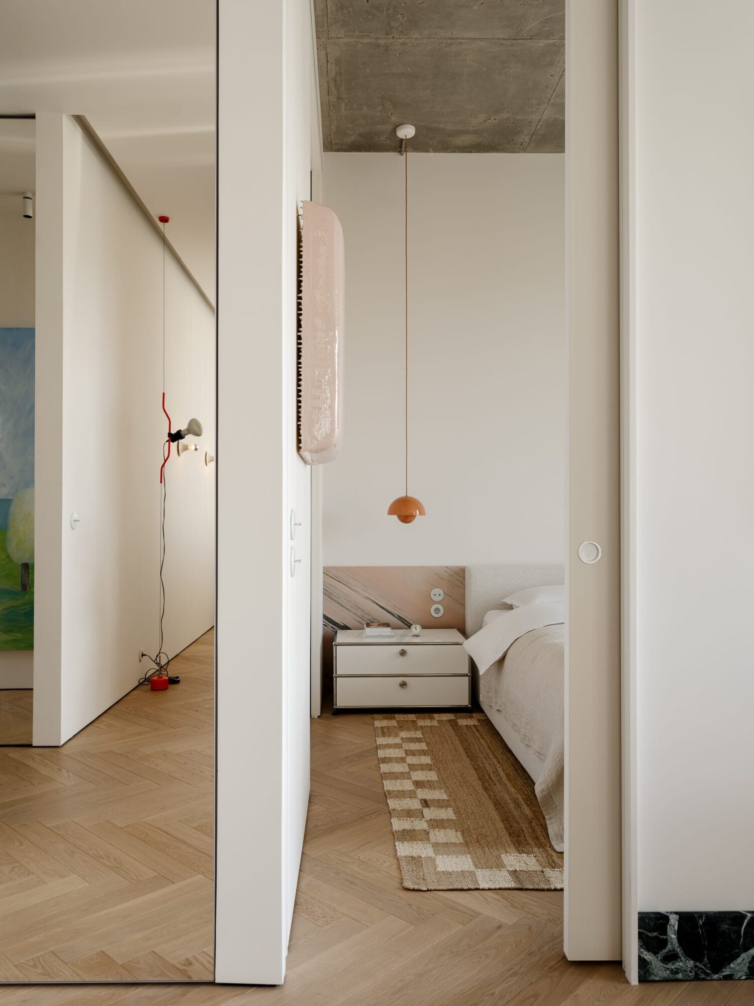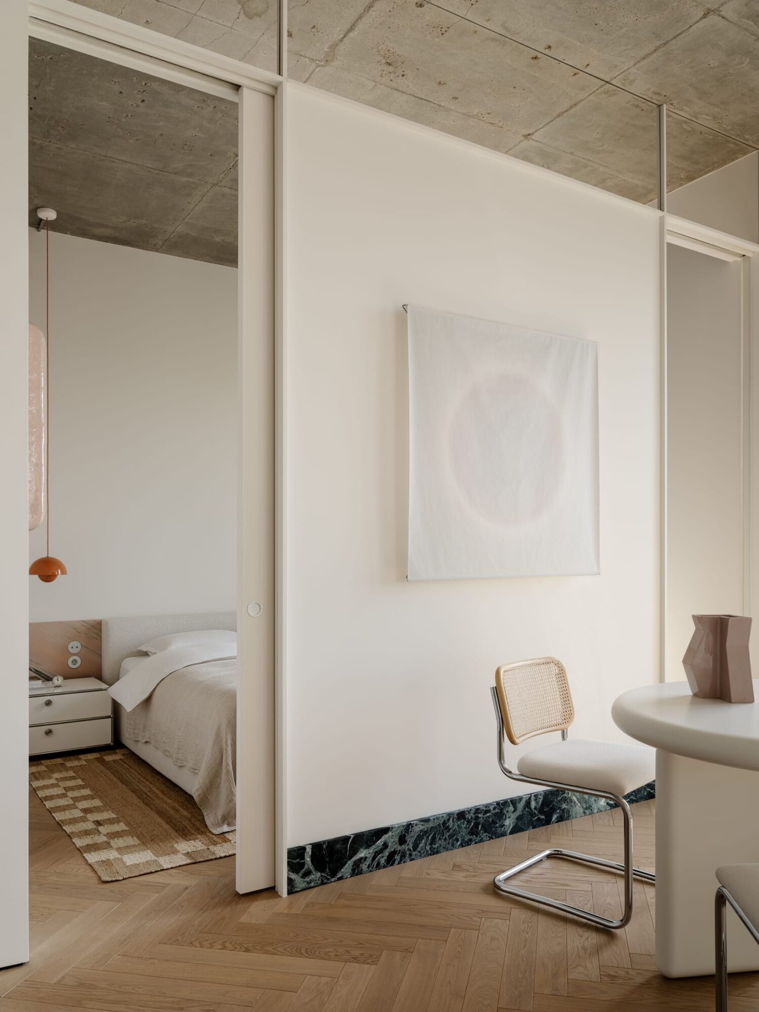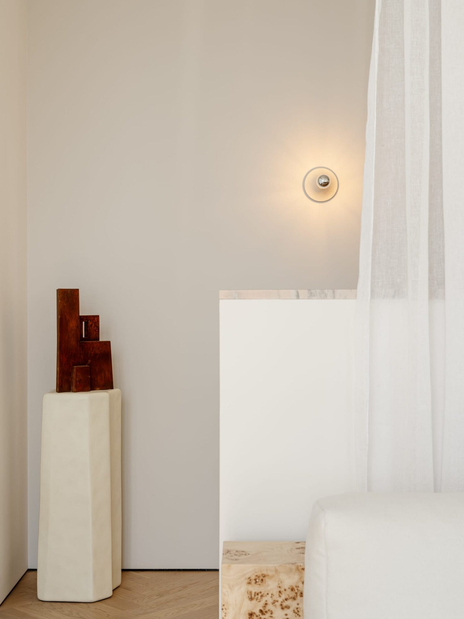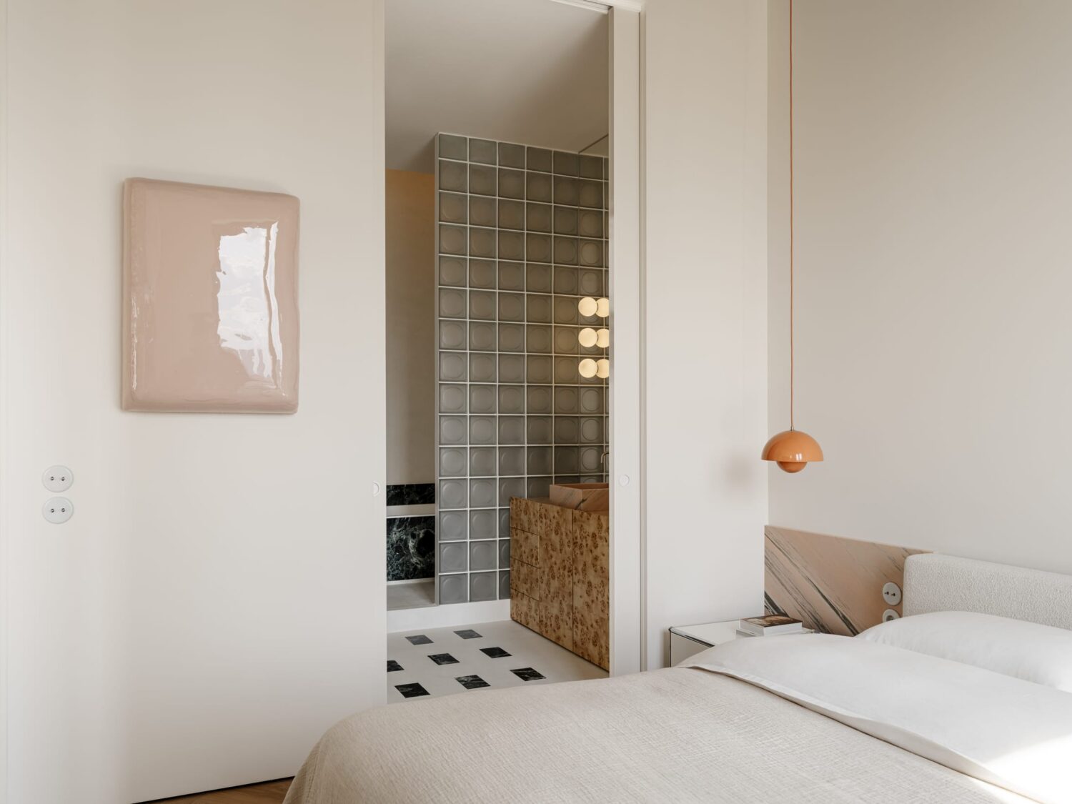 Việc bố trí lại hoàn toàn mặt bằng đã biến căn hộ thành một không gian lưu thông tuần hoàn liên tục, tạo nên một đài quan sát ngoạn mục trên cao nhìn xuống thành phố. Tầm nhìn toàn cảnh thành phố hiện ra từ mọi góc độ—thậm chí từ phòng tắm—khiến chính thành phố trở thành một phần của câu chuyện nội thất. Ánh sáng tự nhiên lan tỏa tự do, làm mềm mại các đường nét hình học và mang lại cảm giác thoải mái, giúp cho sự chính xác không trở nên cứng nhắc. Kostik mô tả không gian này tồn tại giữa cấu trúc và cảm xúc, giữa sự thân mật và sự cởi mở—một sự đối lập định hình nên đặc điểm của nó. Tính thẩm mỹ phục vụ cho tâm trạng chứ không phải chi phối nó. Và bằng cách đó, căn hộ này đã tạo nên một lập luận thuyết phục một cách tinh tế về việc sử dụng gam màu trung tính như một lựa chọn thiết kế mạnh mẽ: một lựa chọn đòi hỏi kỹ năng, sự tiết chế và sự hiểu biết sâu sắc về cách mà sự tương phản—về sắc độ, kết cấu và hình dạng—tạo ra những không gian hấp dẫn, được cân nhắc kỹ lưỡng và sống động.