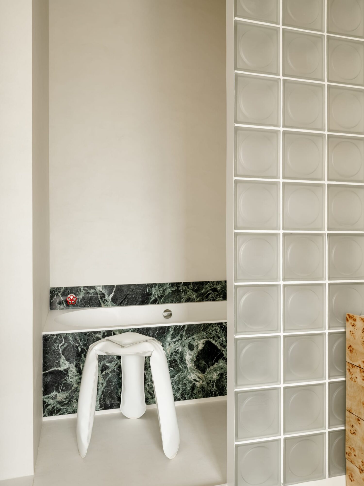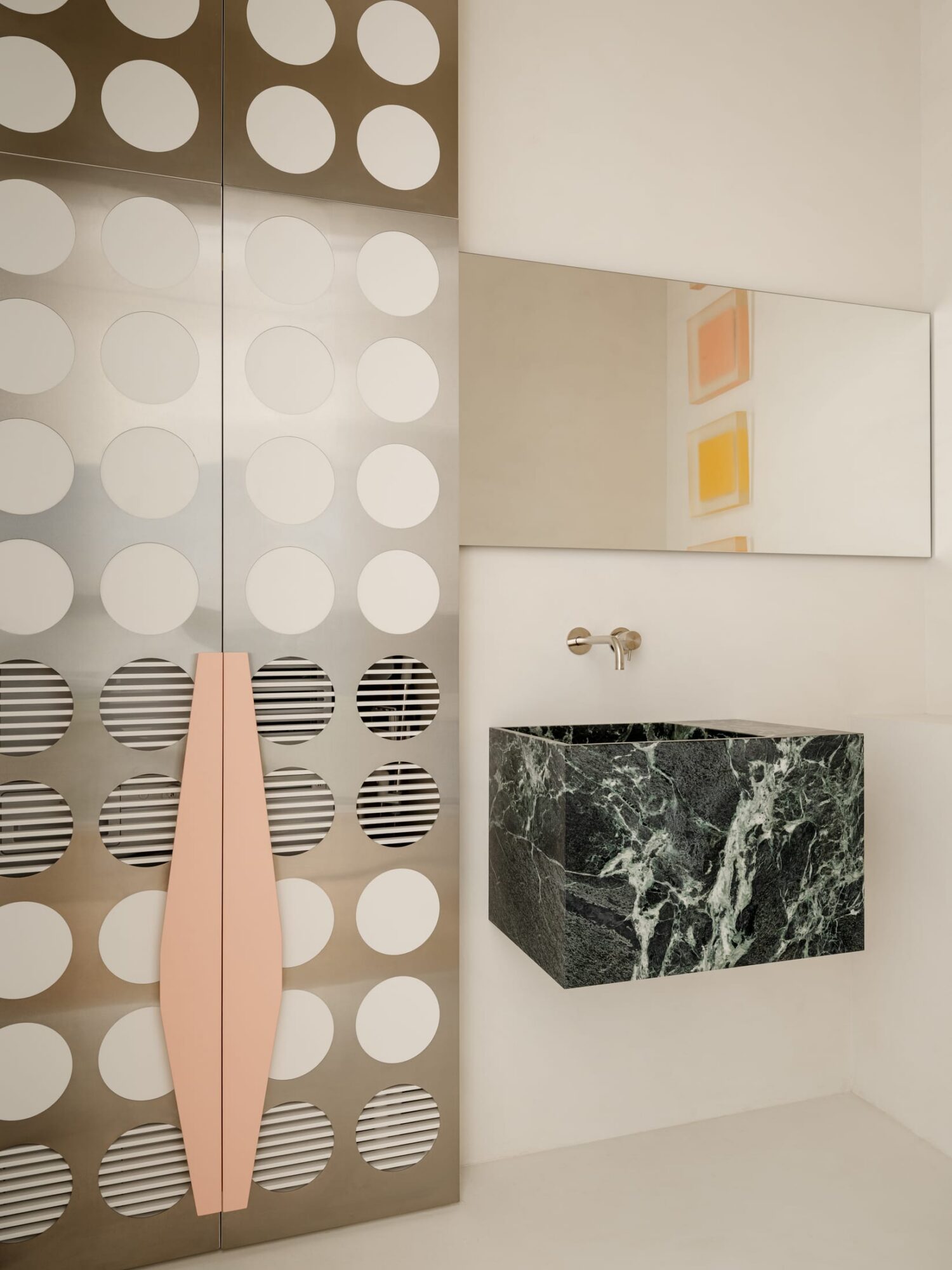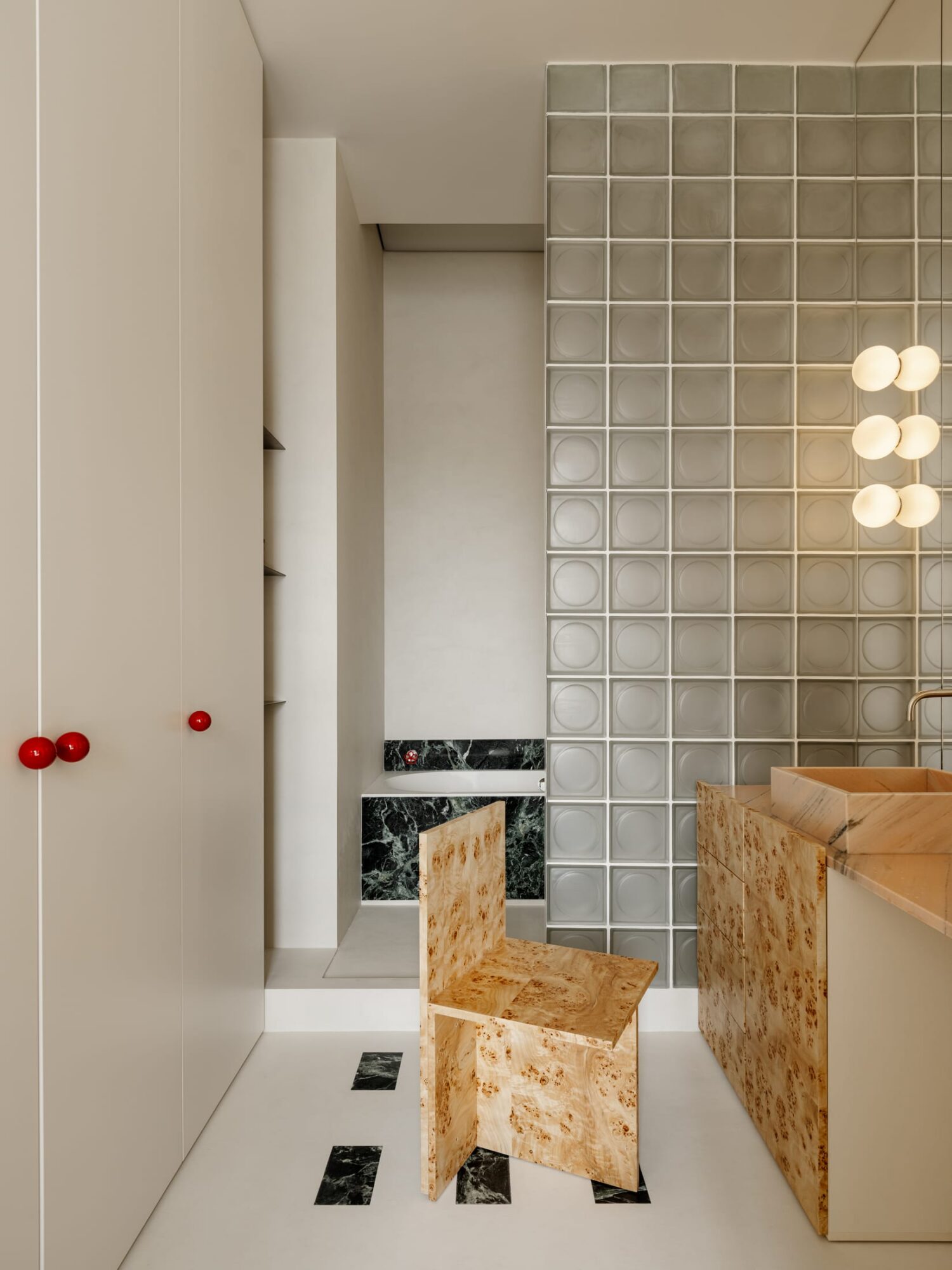 Bê tông, rễ cây dương, đá cẩm thạch Verde Alpi và Royal Rosa, thép không gỉ mài bóng—mỗi chất liệu được lựa chọn vì sự chân thực và cảm giác khi chạm vào. Bảng màu khá hẹp, nhưng sự tương tác giữa kết cấu và sự biến đổi bề mặt tạo nên sự căng thẳng thị giác. Không có gì ở đây tạo cảm giác phẳng lặng. Không có gì tạo cảm giác an toàn theo một cách sai lầm. Cách tiếp cận phong cách hiện đại giữa thế kỷ cũng được xem xét kỹ lưỡng. Đây không phải là sự hoài cổ được khoác lên mình vỏ bọc thiết kế—mà là một ngôn ngữ sống động, được diễn giải lại thông qua logic kiến trúc và bối cảnh cụ thể của thành phố. Ghế Knoll, tủ lưu trữ USM và đèn chiếu sáng của Flos, Atelier Areti, Zieta, Artemide, Ingo Maurer và Martinelli Luce cùng chia sẻ không gian với thảm Nordic Knots và các vật dụng trang trí của Iconico và Fantini, bên cạnh đồ nội thất và tác phẩm nghệ thuật đặt làm riêng của chính Kostik. Kết quả mang lại cảm giác hiện đại chính xác bởi vì nó không cố gắng quá sức để trở nên lỗi thời.