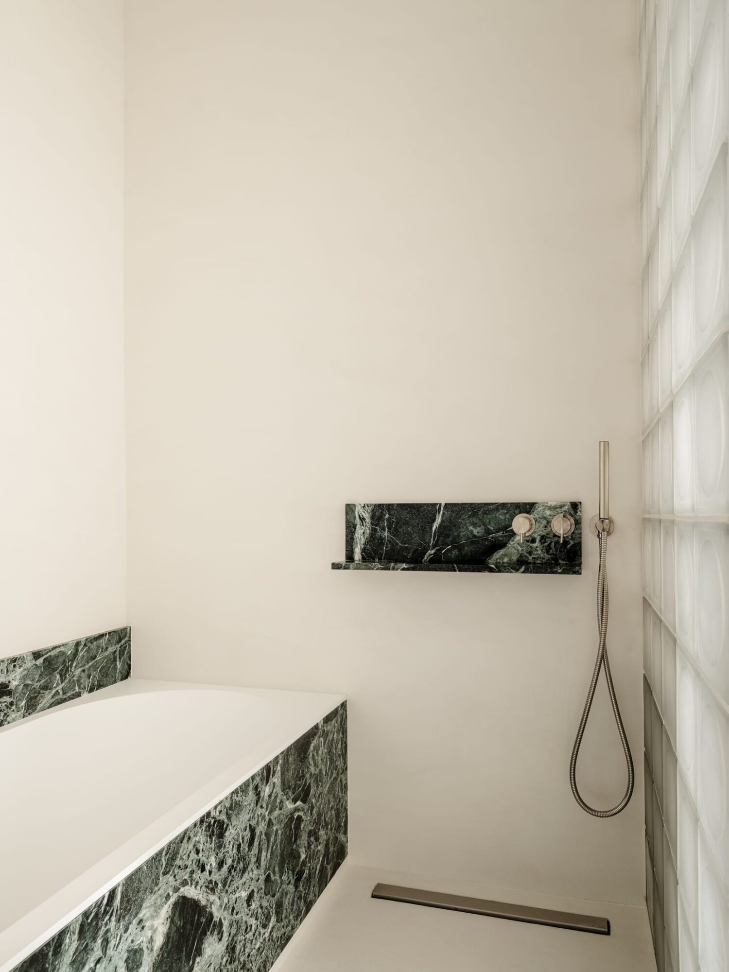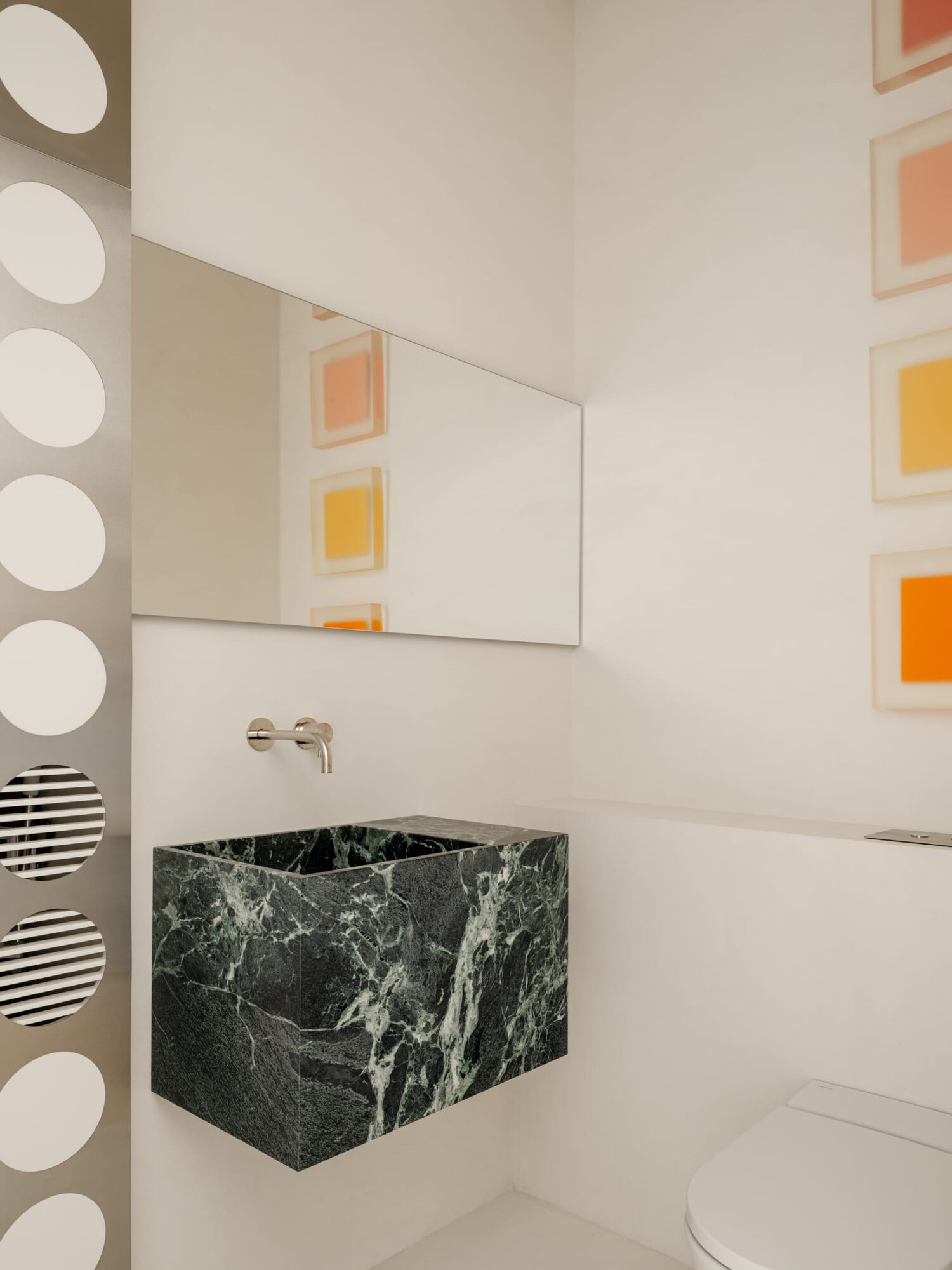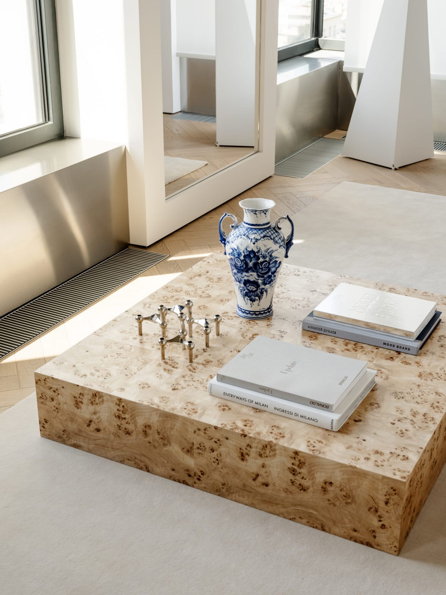 Bê tông, rễ cây dương, đá cẩm thạch Verde Alpi và Royal Rosa, thép không gỉ mài bóng—mỗi chất liệu được lựa chọn vì sự chân thực và cảm giác khi chạm vào. Bảng màu khá hẹp, nhưng sự tương tác giữa kết cấu và sự biến đổi bề mặt tạo nên sự căng thẳng thị giác. Không có gì ở đây tạo cảm giác phẳng lặng. Không có gì tạo cảm giác an toàn theo một cách sai lầm. Cách tiếp cận phong cách hiện đại giữa thế kỷ cũng được xem xét kỹ lưỡng. Đây không phải là sự hoài cổ được khoác lên mình vỏ bọc thiết kế—mà là một ngôn ngữ sống động, được diễn giải lại thông qua logic kiến trúc và bối cảnh cụ thể của thành phố. Ghế Knoll, tủ lưu trữ USM và đèn chiếu sáng của Flos, Atelier Areti, Zieta, Artemide, Ingo Maurer và Martinelli Luce cùng chia sẻ không gian với thảm Nordic Knots và các vật dụng trang trí của Iconico và Fantini, bên cạnh đồ nội thất và tác phẩm nghệ thuật đặt làm riêng của chính Kostik. Kết quả mang lại cảm giác hiện đại chính xác bởi vì nó không cố gắng quá sức để trở nên lỗi thời.