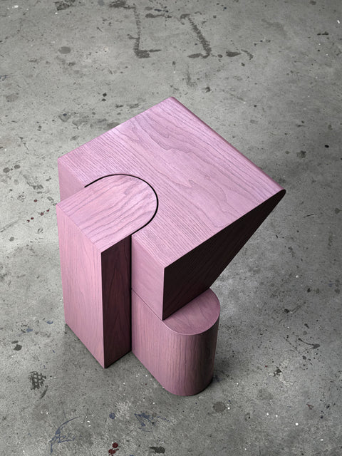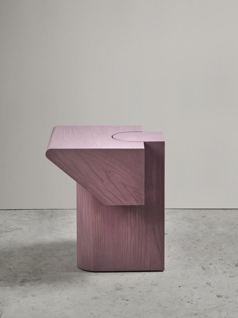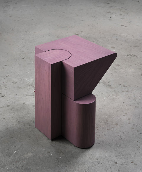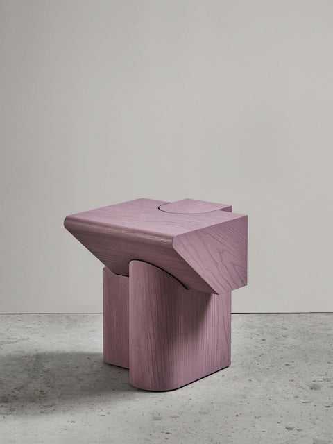 Mẫu đôn này mang dáng vẻ như một khối điêu khắc hơn là một món nội thất thông thường. Toàn bộ được tạo hình từ gỗ tự nhiên với tông màu tím trầm (mauve) độc đáo, bề mặt xử lý mịn, để lộ vân gỗ chạy nhẹ, tạo cảm giác vừa thủ công vừa tinh tế.