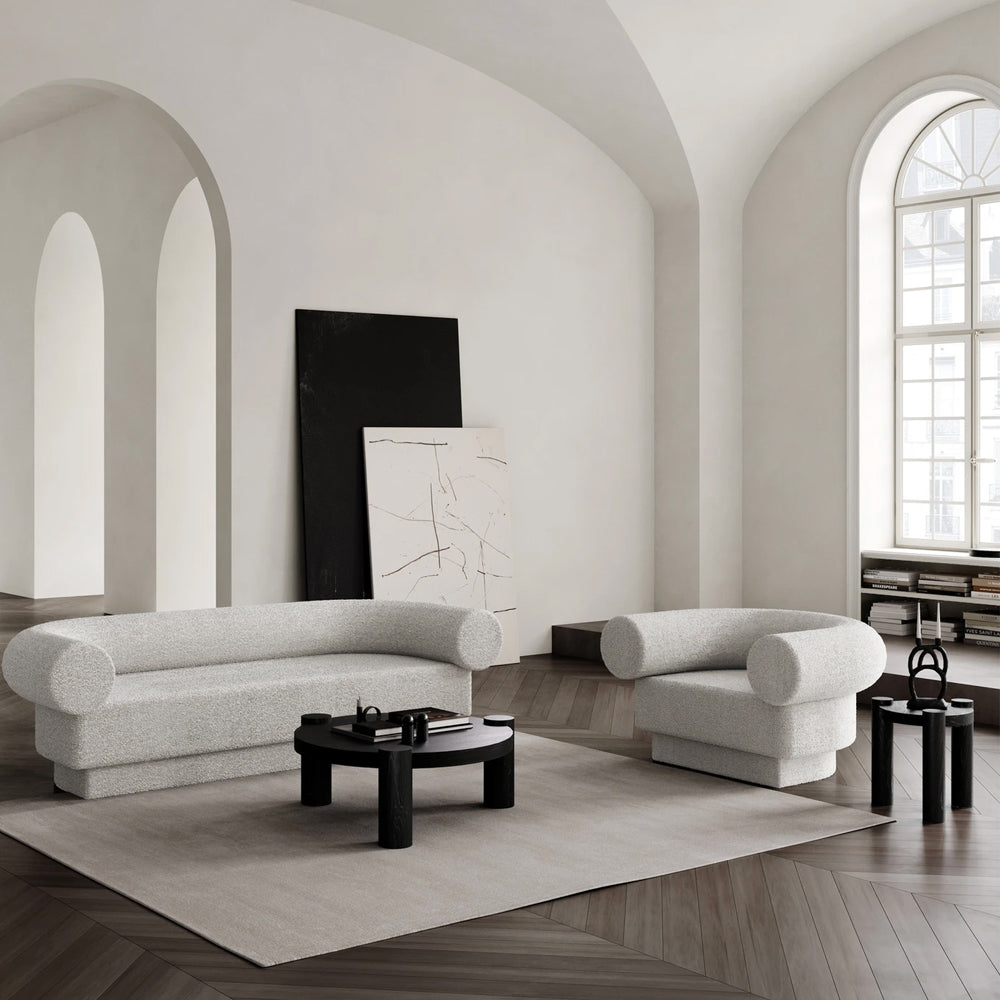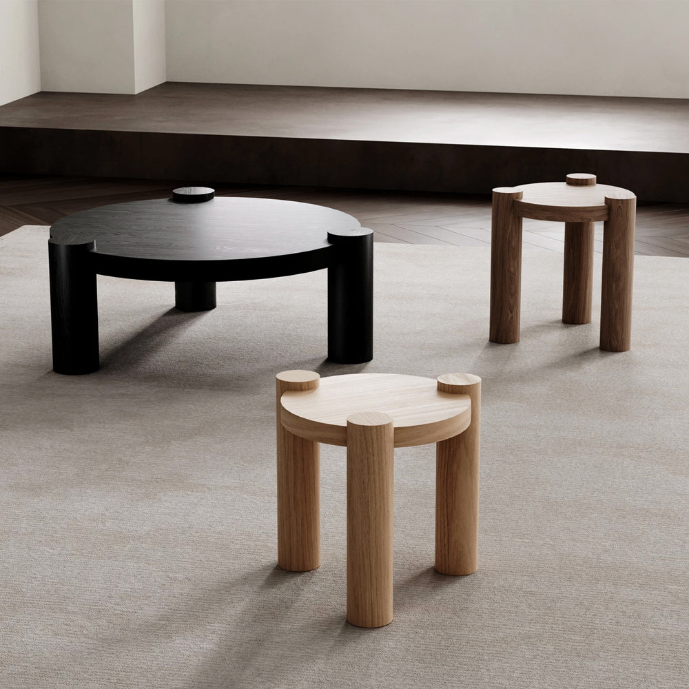 Bàn cà phê Clyde được tạo thành từ các hình tròn, với mặt bàn phẳng được đỡ bằng các chân hình trụ chắc chắn.