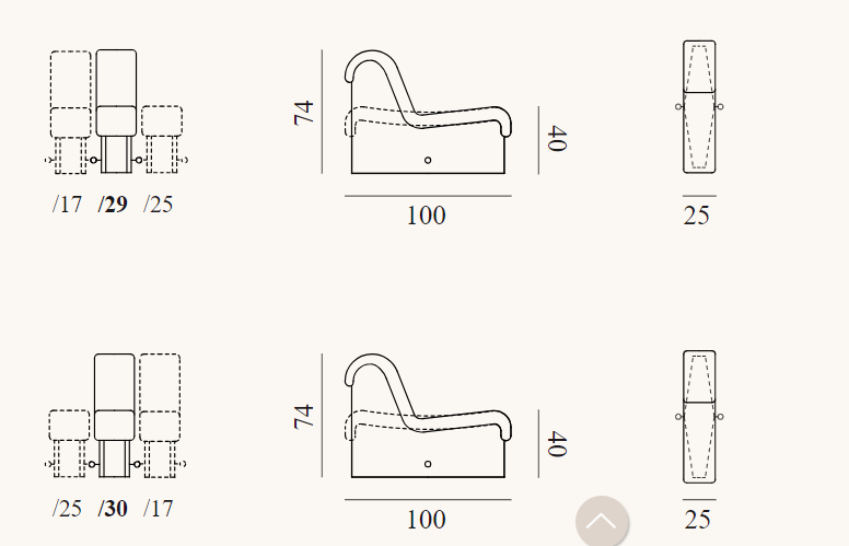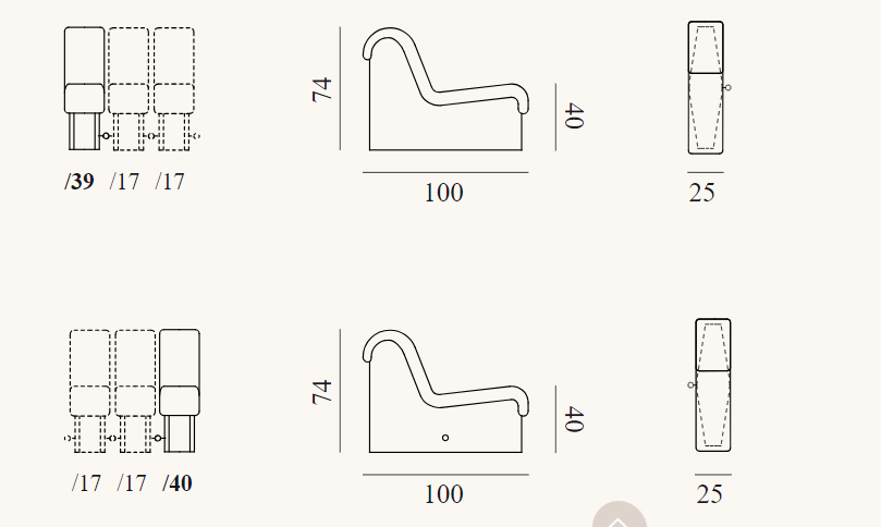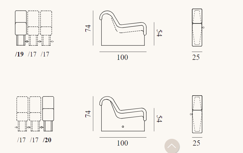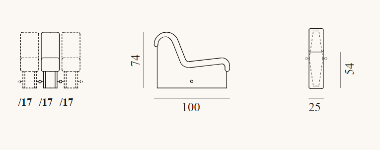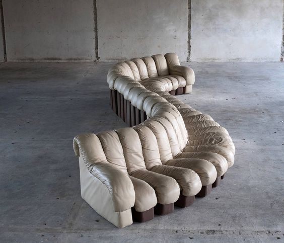 Các yếu tố được kết nối với bản lề plug-in và cấu trúc làm bằng da và dây kéo. Phần tử ghế đẩu bổ sung cho chiếc ghế hình con rắn nổi tiếng với phần tử trung gian và phần cuối.