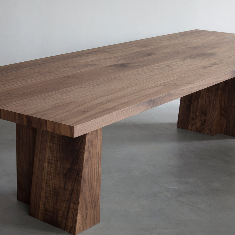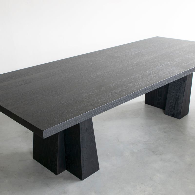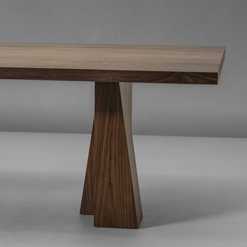 Bàn có hai cặp chân hình thang chắc chắn, có thể sắp xếp ở bất kỳ vị trí mong muốn nào bên dưới mặt bàn. Thích hợp làm bàn họp, bàn ăn hoặc bàn trưng bày với nhiều loại hoàn thiện có sẵn. Một tác phẩm chắc chắn với nét trang trí sinh động.
