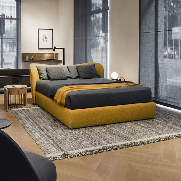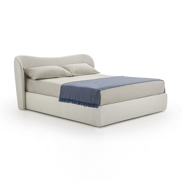 Đặc điểm nổi bật của giường, đầu giường cong, bao bọc phần thân chính của giường trong một vòng ôm bằng chất liệu đầy mời gọi, mang đến bờ vai bảo vệ, yên tâm.
