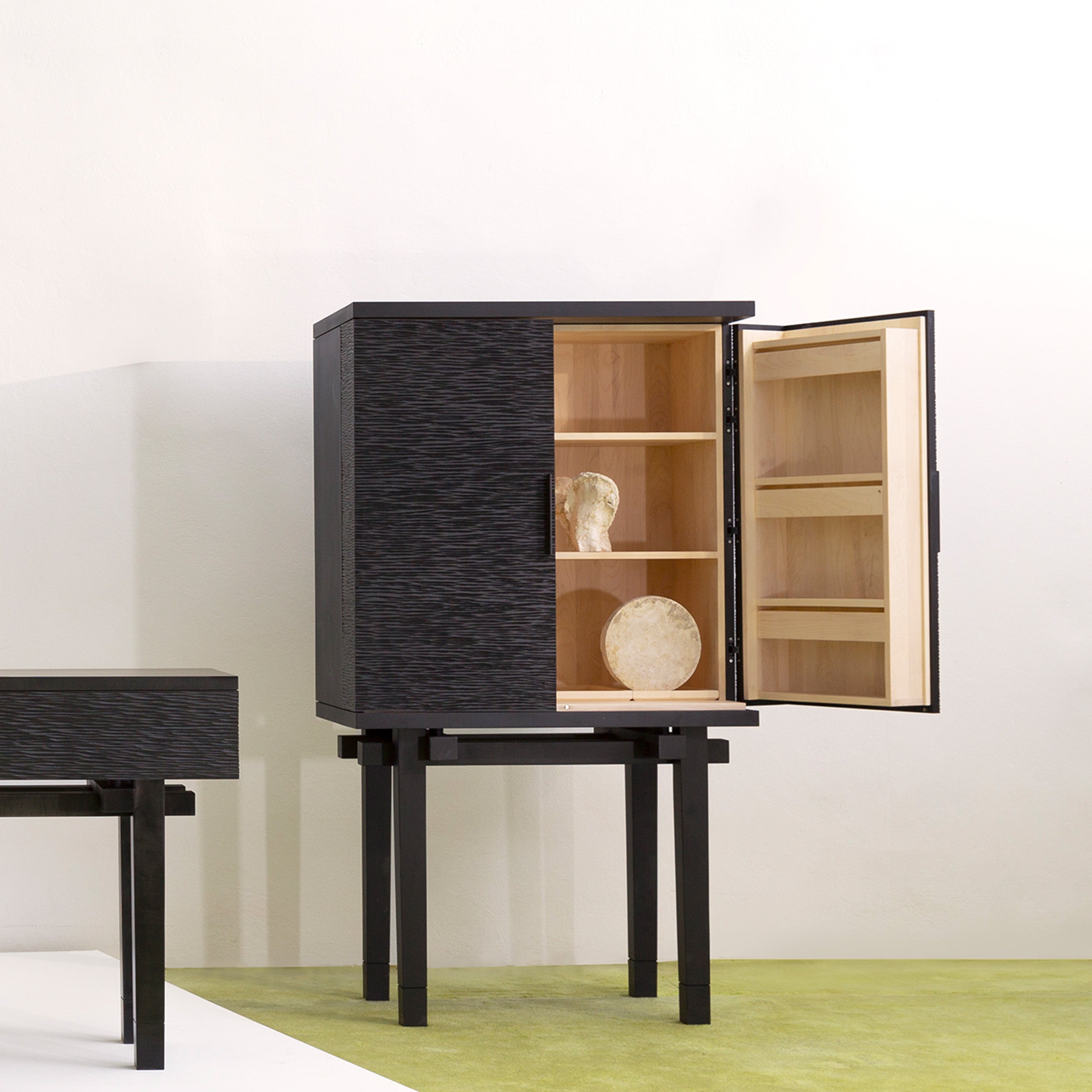Đằng sau những cánh cửa chạm khắc thủ công dày, tủ quầy bar cao ẩn chứa một nội thất phức tạp được thiết kế để lưu trữ và phục vụ rượu vang và đồ uống, đồ ăn và các vật dụng khác để đáp ứng nhu cầu "joie de vivre".