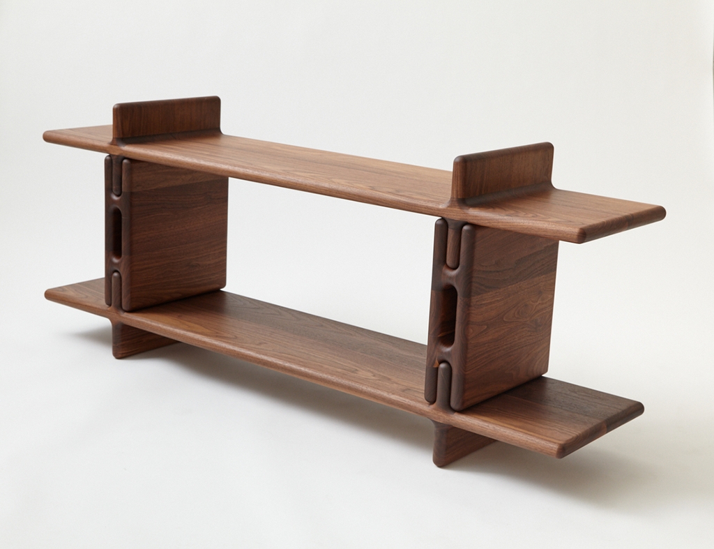Kệ Mesa là sự khám phá về quy mô, phối cảnh và tính mô đun bằng cách sử dụng các hình dạng cong để vượt qua tính chất vật chất của gỗ cứng.