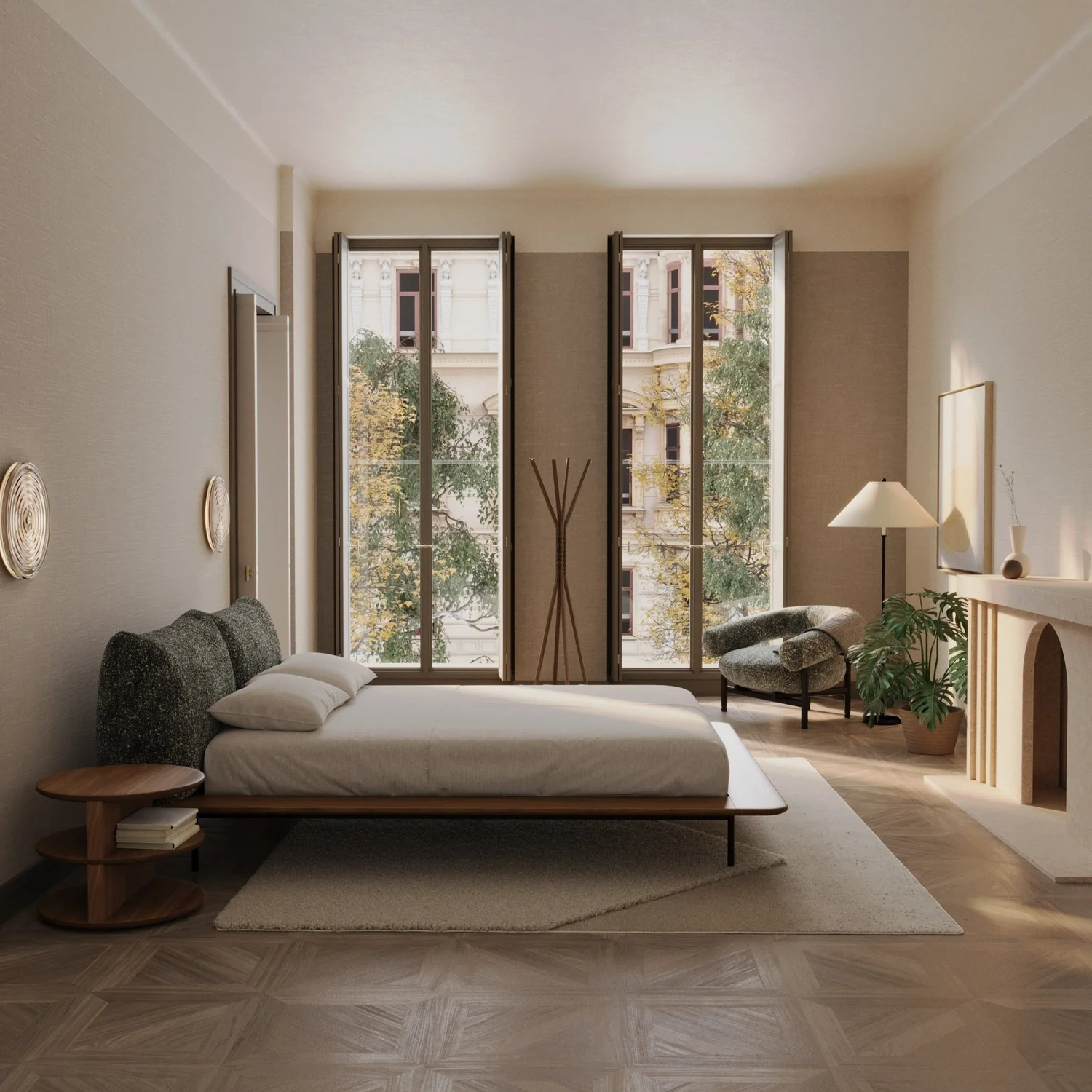 Sự quyến rũ không thể cưỡng lại của chiếc giường là kết quả của sự khéo léo của nó, kết hợp liền mạch với khung gỗ chắc chắn với kiểu dáng thanh mảnh, được hỗ trợ bởi các chân kim loại kín đáo.