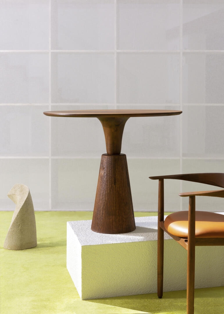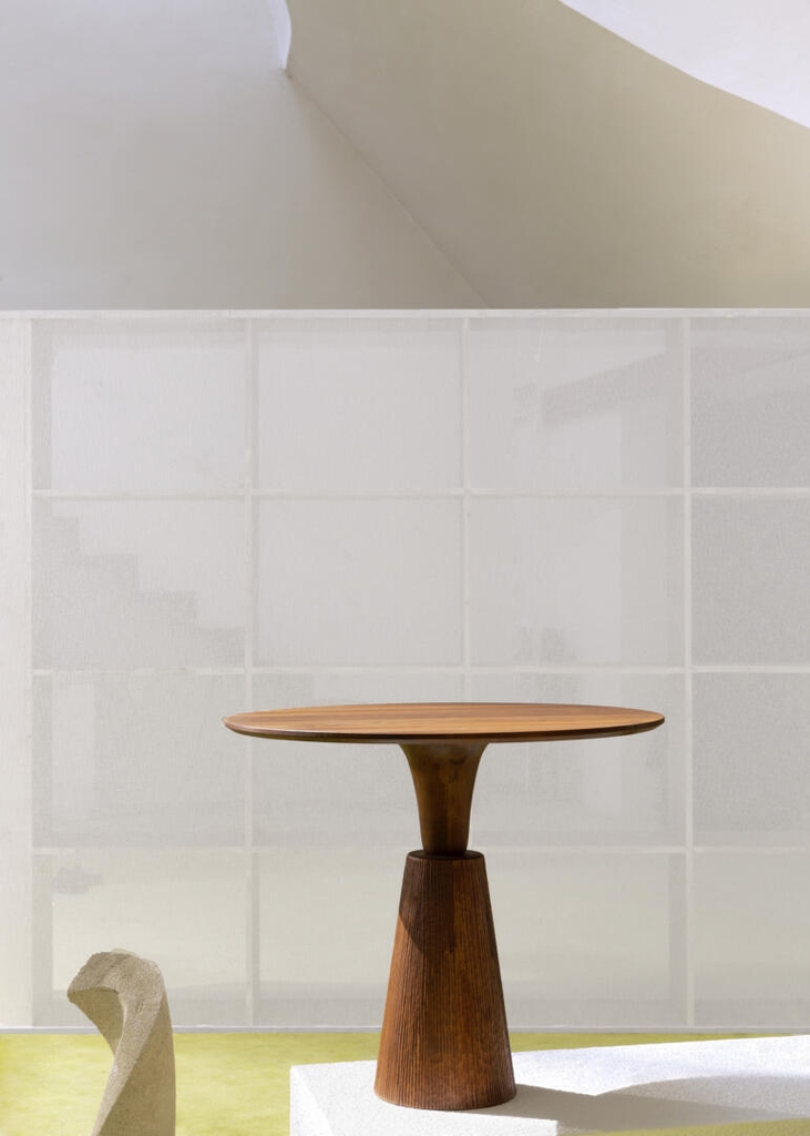Chân bàn trông giống một thân cây do cả hình dáng và hoa văn được chạm khắc bằng tay trên vỏ cây trên bề mặt, đưa chúng ta quay trở lại nguồn gốc của sản phẩm. Cổ bàn nằm đối lập với chân bàn, bề mặt nhẵn và hình dáng cong thanh lịch của một chiếc chuông kèn