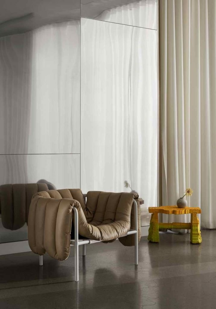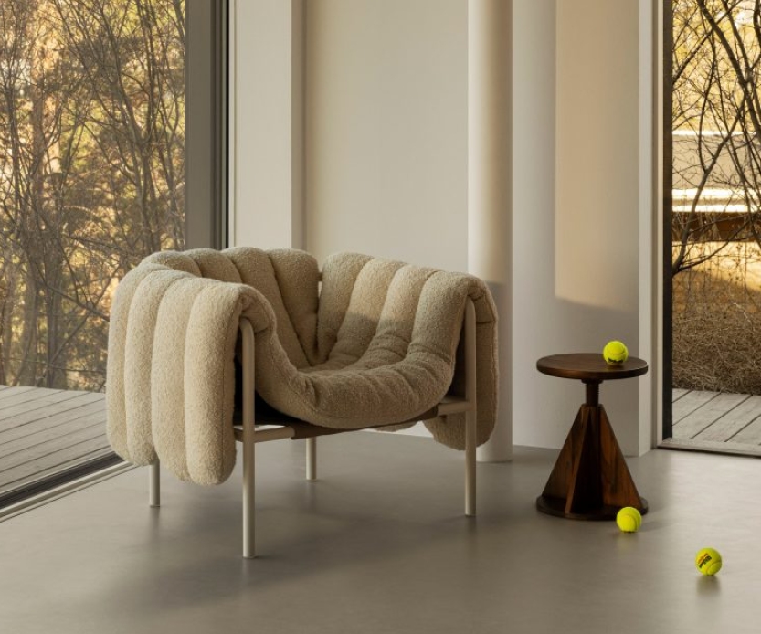Lấy cảm hứng từ đồ nội thất khung thép hiện đại cổ điển, Puffy Lounge tán tỉnh sự xa hoa nhờ lớp bọc giống như chăn bông chần bông bao bọc người ngồi trong một vòng tay ấm áp.