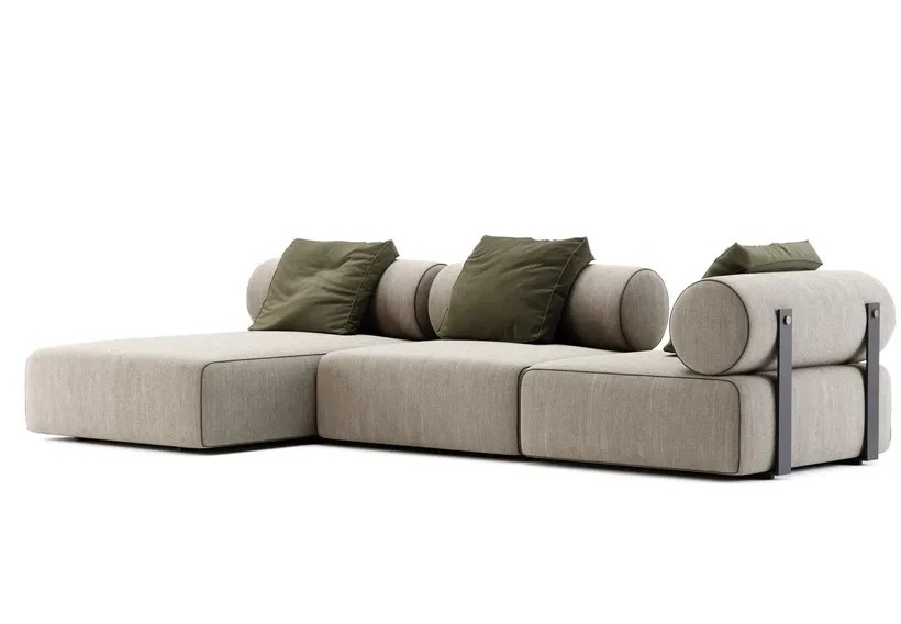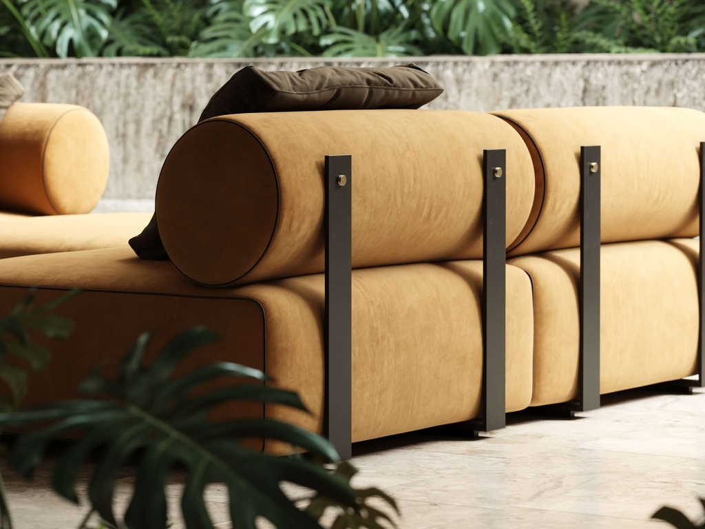 Ở mặt sau của mỗi mô-đun, hai thanh thép có họa tiết màu đen trượt xuống đáy ghế sofa, nổi bật với các chi tiết thép không gỉ màu vàng tinh tế.