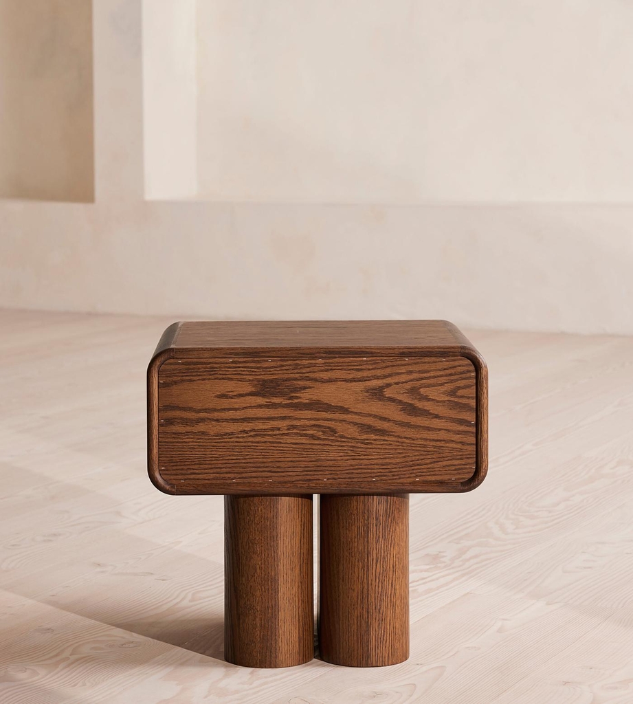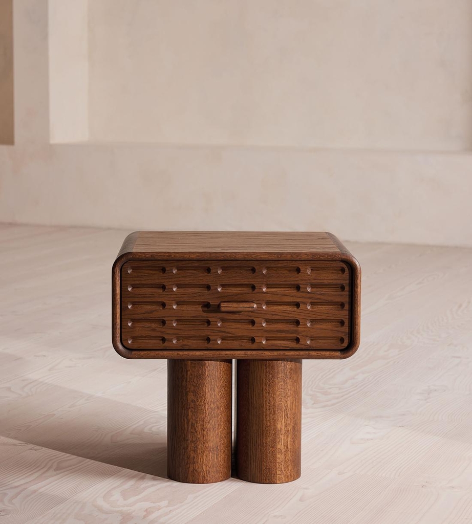 Được chạm khắc từ gỗ tần bì nhập khẩu , chiếc tủ đầu giường này có một ngăn kéo lưu trữ lớn được trang trí bằng họa tiết hình học.Được chạm khắc tinh xảo vào mặt trước ngăn kéo, họa tiết hình viên thuốc hoàn toàn phù hợp với tay cầm. Các cạnh cong và chân tròn, hình trụ tương phản với mặt bàn hình chữ nhật