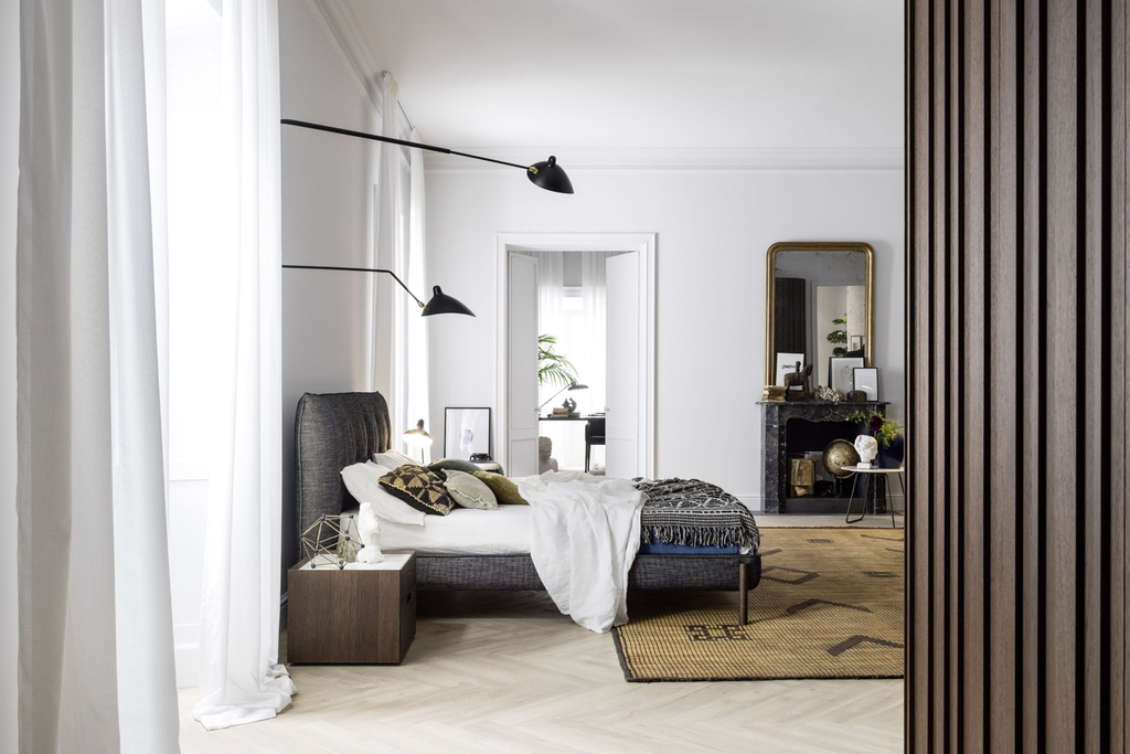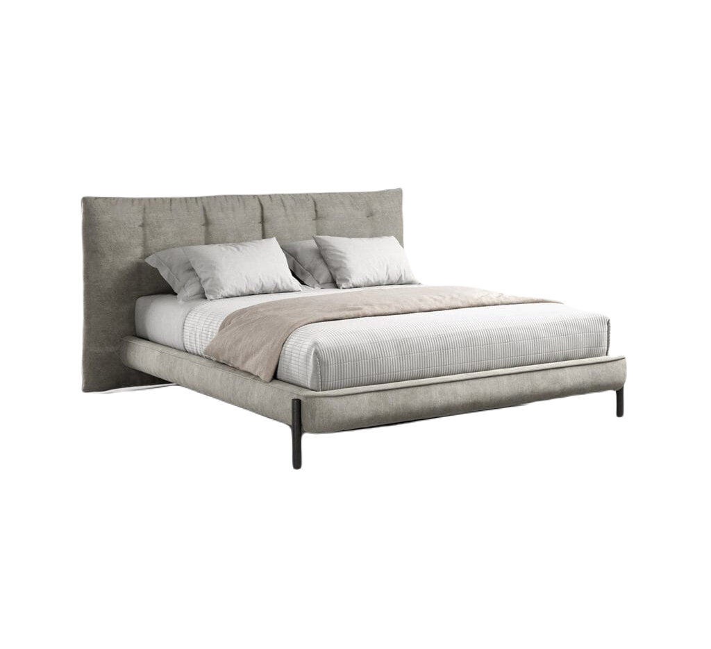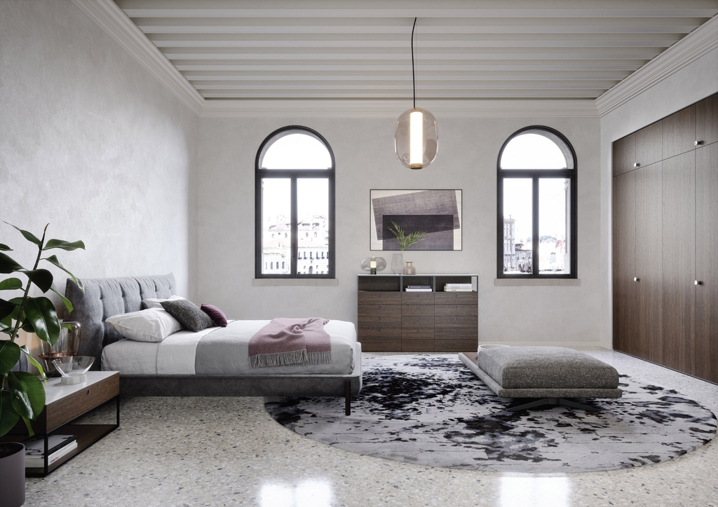 Một nghiên cứu về sự đơn giản với nhiều thiết kế kiểu Ý: Giường đôi bọc nệm Tufté do Novamobile trình bày. Khung giường có các góc bo tròn, hai chân gỗ tạo điểm nhấn và đầu giường hình chữ nhật với những đường khâu dọc, chất liệu vải được làm với tông màu ấm áp và tinh tế. Tufté là phụ kiện được sản xuất tại Ý.