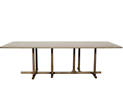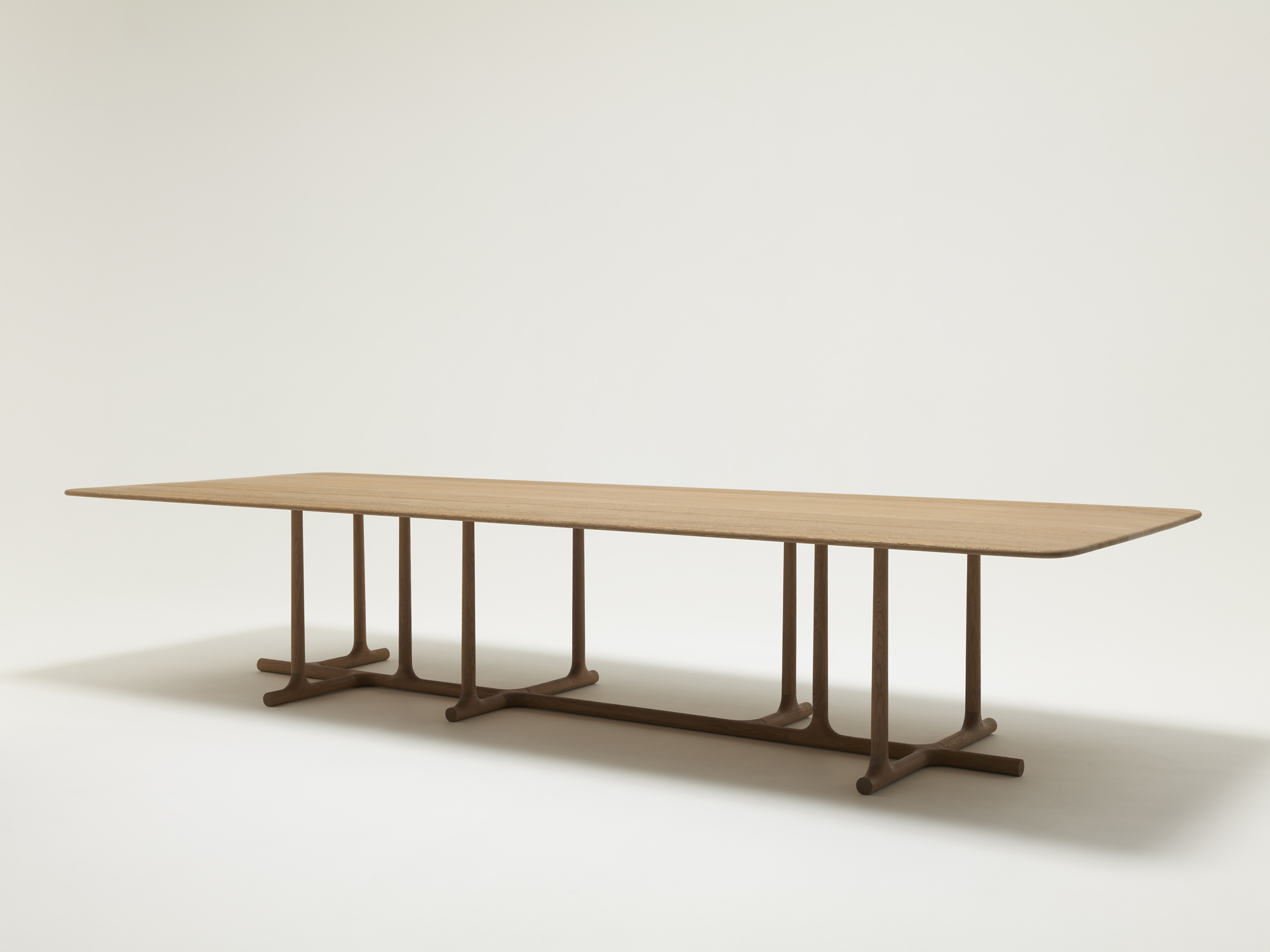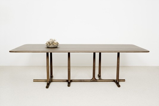 Sự bất đối xứng vuông góc của thiết kế chân làm nổi bật chất lượng nguyên sơ của mặt bàn trong bộ bàn ăn tuyệt đẹp này của nhà thiết kế Christophe Delcourt.