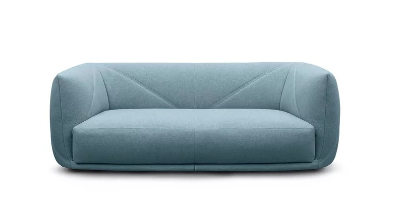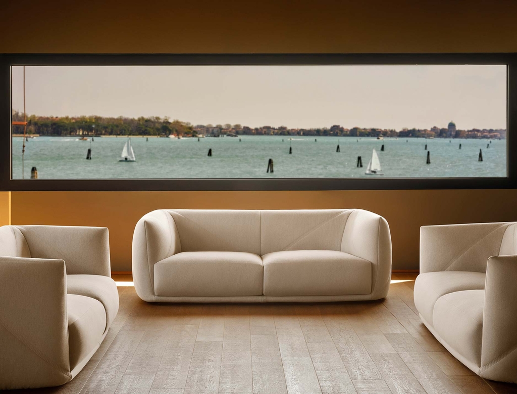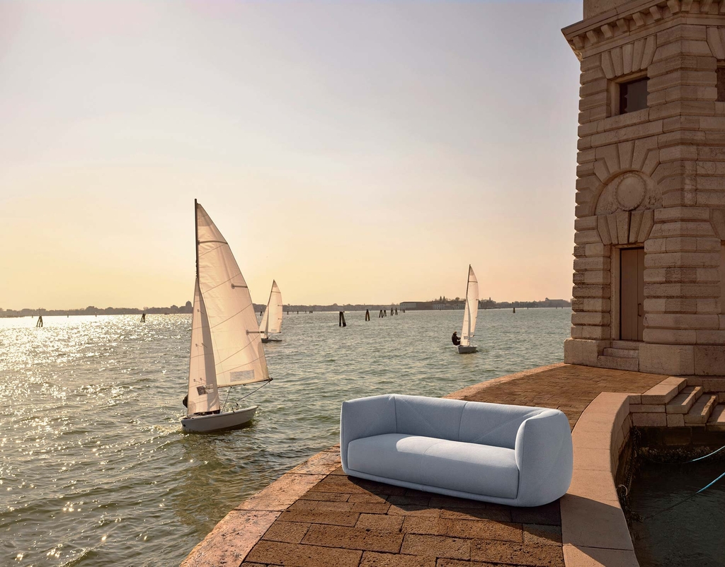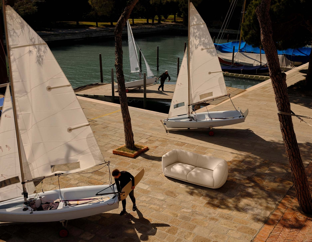 Vải bọc được cắt ngang bởi các đường xác định gợi nhớ một cách tinh tế đến cánh buồm chính và cần trục, phần còn lại có hình dạng của ghế sofa.